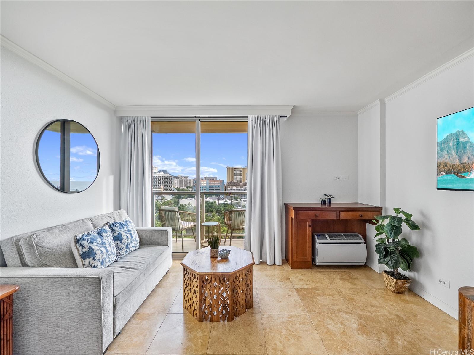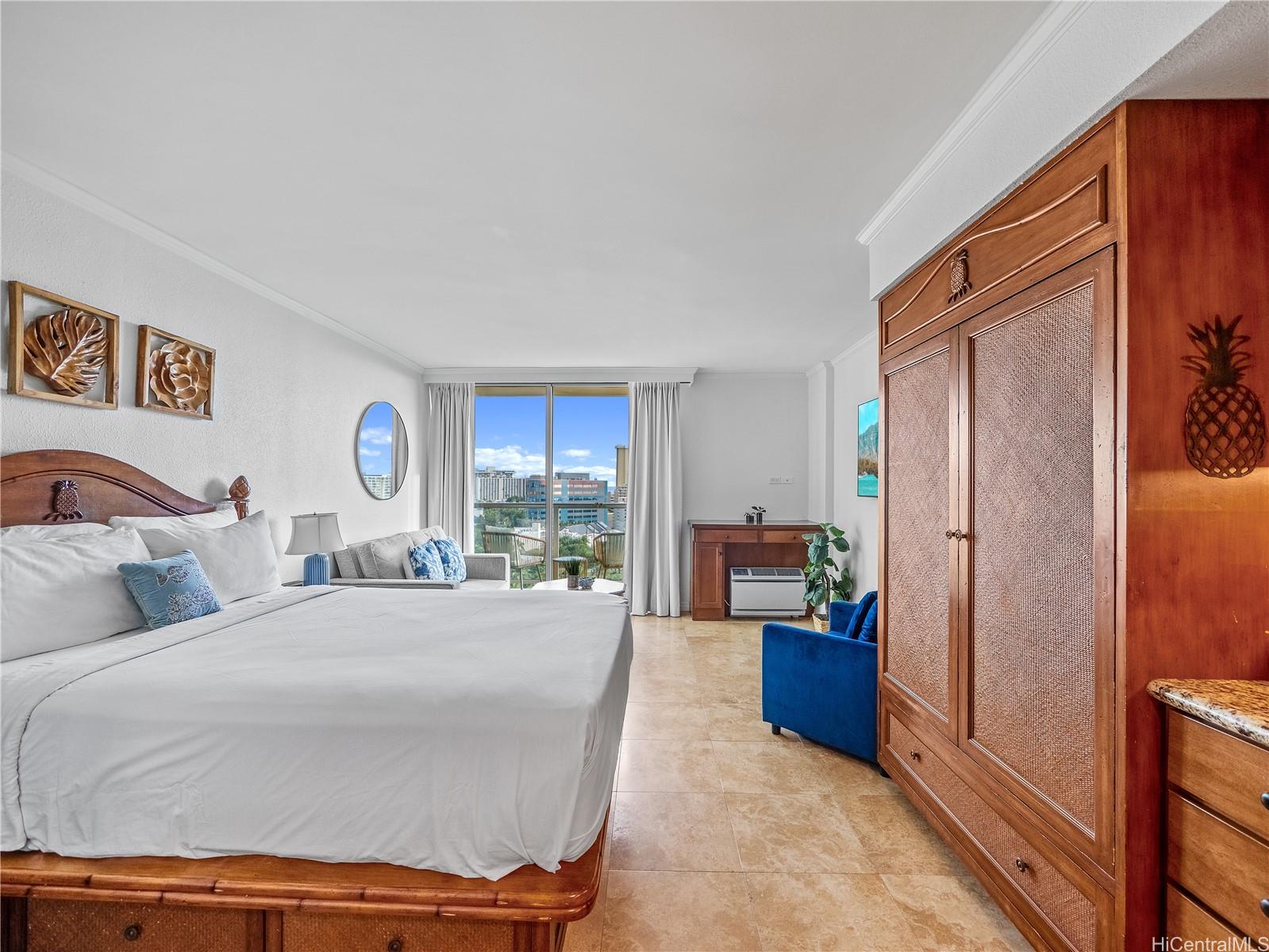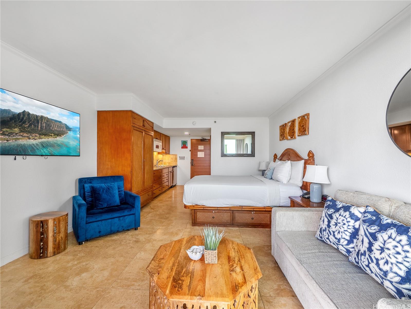This furnished studio offers a smart layout with a queen bed and sofa sleeper, plus a convenient kitchenette equipped with a cooktop, mini refrigerator, and microwave; ideal for light meals and extended stays. Enjoy hotel-style amenities including a swimming pool, BBQ area, and fitness center/gym, all in a prime Waikiki location near beaches, dining, and shopping. A newly announced luau experience nearby is anticipated to enhance the area’s resort-style appeal. Rare opportunity to own a standout Luana Waikiki ocean-view studio with Fort DeRussy Park views and a lanai.