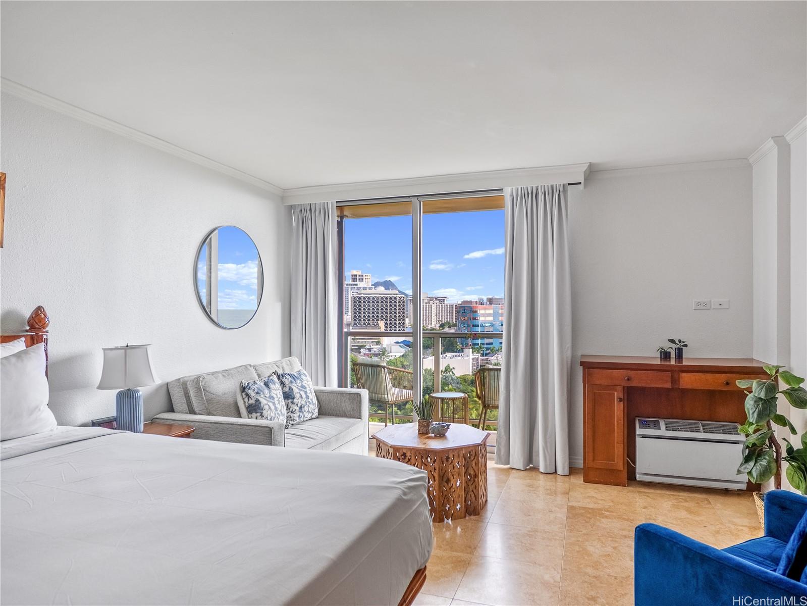 ルアナ・ワイキキの中でも希少な高層階のオーシャンビュー・スタジオ。人気の高い9階建てのこの物件は、遮るもののない海の景色とフォート・デ・ルーシー公園を一望できます。プライベート・ラナイからは、公園から海まで続く雄大な景色を眺め、ワイキキで人気の金曜夜の花火をお楽しみいただけます。家具付きのこのスタジオは、クイーンサイズベッドとソファベッドを備えたスマートなレイアウトに加え、コンロ、ミニ冷蔵庫、電子レンジを備えた便利な簡易キッチンを備え、軽食や長期滞在に最適です。ビーチ、レストラン、ショッピングに近いワイキキの最高のロケーションで、プール、バーベキューエリア、フィットネスセンター/ジムなど、ホテル並みのアメニティをお楽しみください。最近発表された近隣でのルアウ体験は、このエリアのリゾートスタイルの魅力をさらに高めると期待されています。フォート・デ・ルーシー公園の景色とラナイを備えた、ルアナ・ワイキキの傑出したオーシャンビュー・スタジオを所有する貴重な機会です。