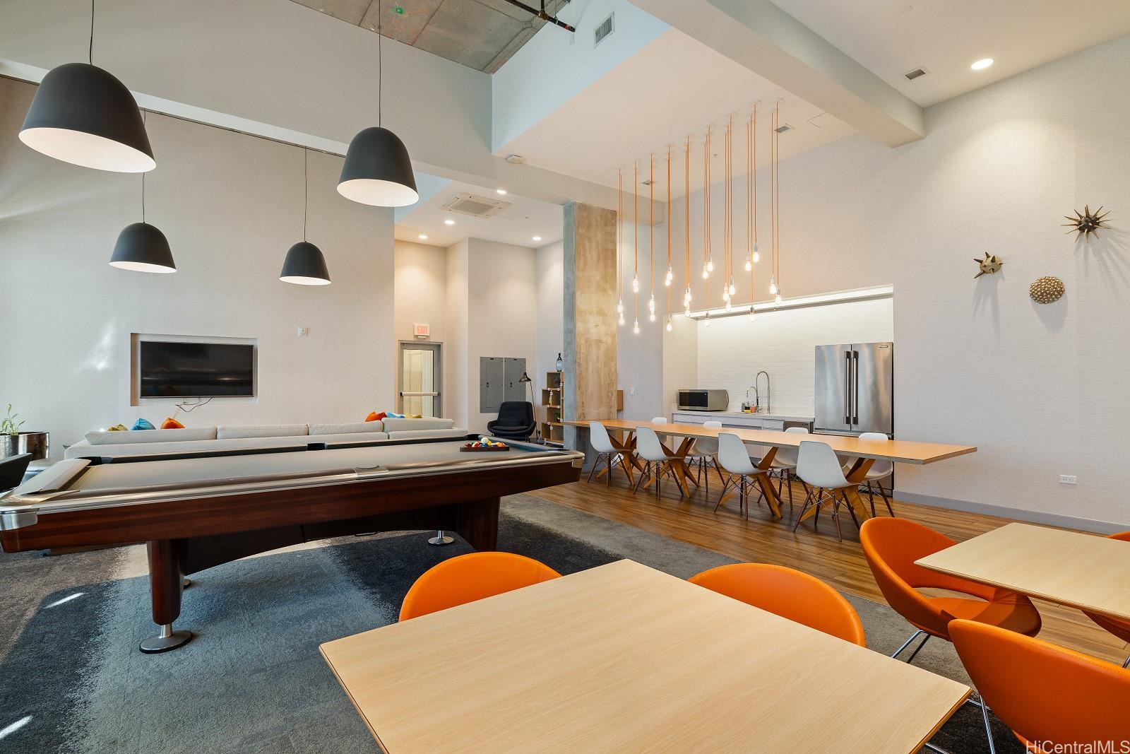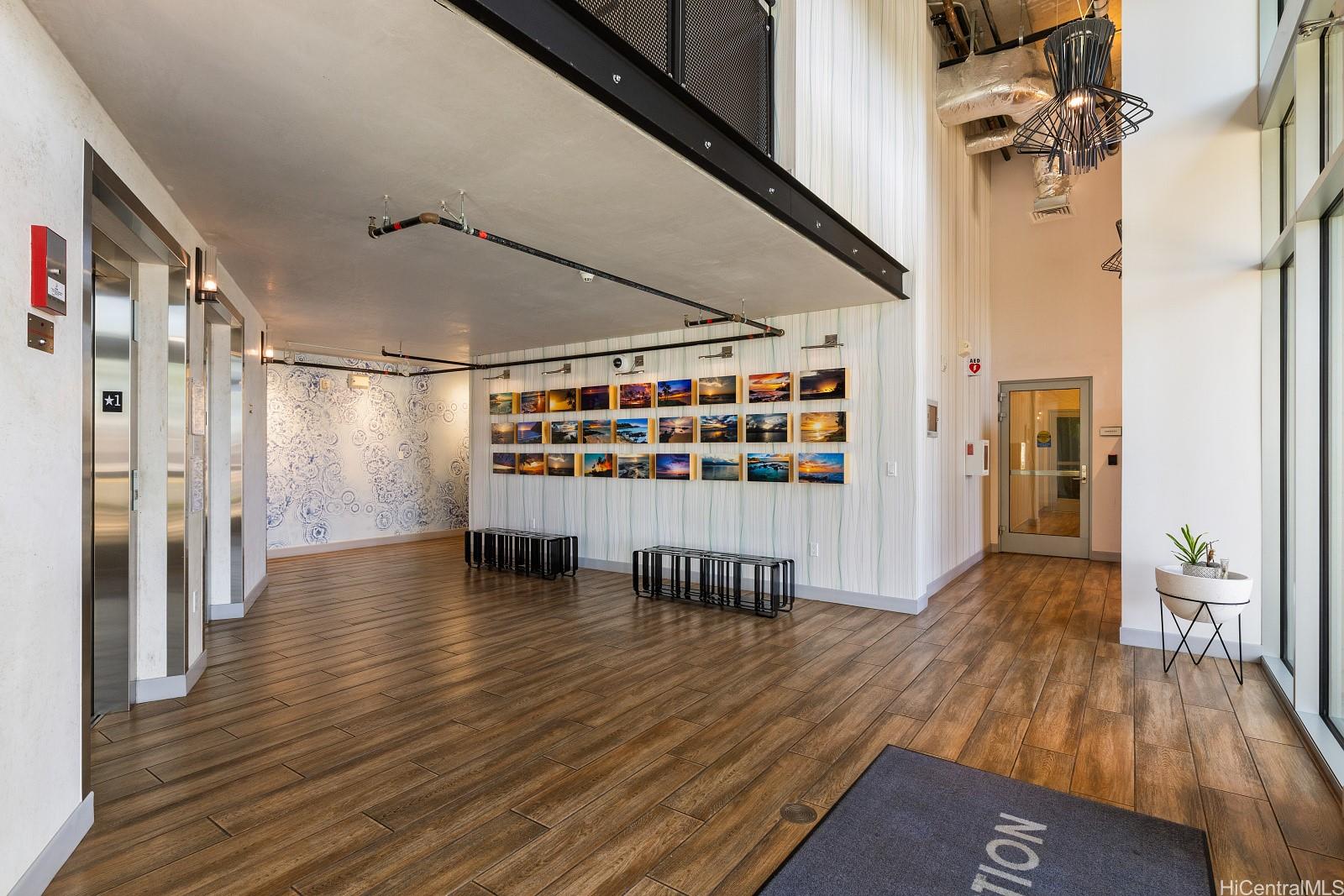Rarely available 2-bedroom, 2-bath corner end unit at The Collection Lofts in Kakaako. This highly sought-after residence is one of only six two-bedroom units in the building—and one of just three offering a private lanai with coastline and sunset views. Boasting 9–10 ft ceilings and an open-concept design fill the home with natural light. The contemporary kitchen features sleek white glass cabinetry, natural quartz countertops, and stainless steel appliances. Brand-new luxury vinyl flooring and fresh interior paint provide a modern, move-in-ready finish throughout. Additional highlights include a separate 23 sq ft ground-floor STORAGE ROOM plus an extra storage locker. Enjoy the rare convenience of two covered, side-by-side full-size parking stalls located near the garage entrance—offering easy in-and-out access without navigating multiple levels. Building amenities include 24-hour security, a pet-friendly community, large private recreation/party room, fitness center, and bike and surfboard storage. Live in the heart of vibrant Kakaako, just around the block from SALT, Starbucks, Down to Earth, H-Mart, UH Medical School, parks, trendy restaurants and cafes.