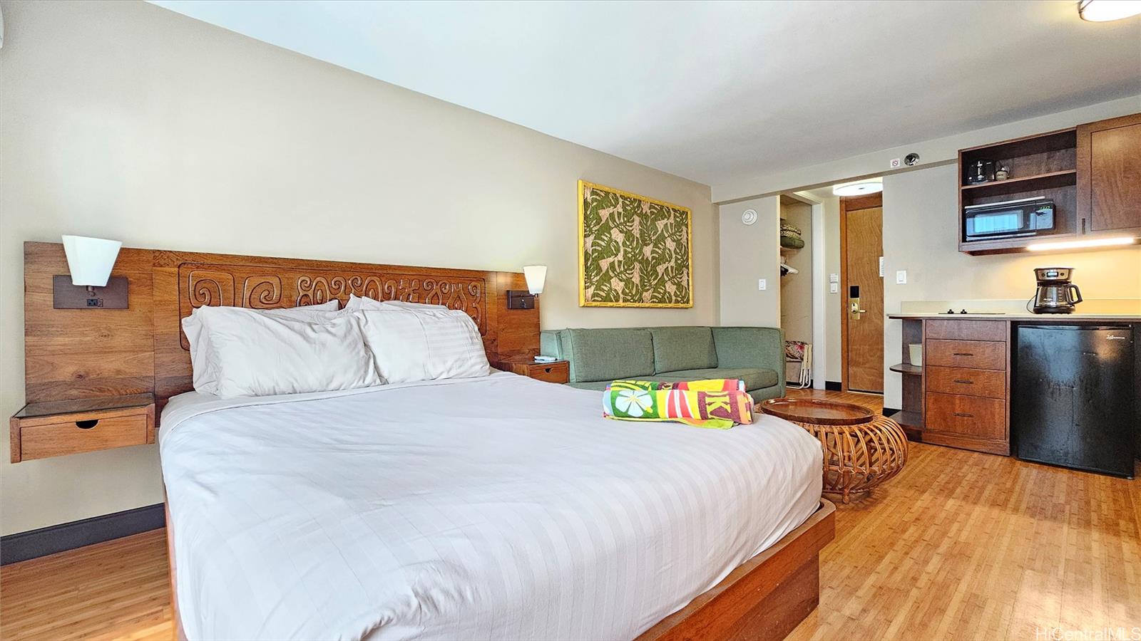 ブティックホテル「バンブー・ワイキキ」にある、すぐに使える264平方フィートのスタジオタイプ物件をご覧ください。短期レンタルが法的に許可されており、リゾート地区に位置しています。家具付きのこの物件は、クヒオ通りから少し離れた静かな場所にあり、ワイキキからすぐの静かな隠れ家です。設備には、2口コンロ付きの簡易キッチン、フルサイズの冷蔵庫、電子レンジ、コーヒーメーカー、バスタブとシャワー付きのバスルームがあります。最近のアップグレードには、新しいスプリットエアコン、防音ガラスドア、改装されたエレベーターが含まれます。物件には、熱帯植物に囲まれた滝のあるラグーンスタイルのプールがあります。その他のアメニティには、ジャグジー、バーベキュー施設、ラウンジチェア、茅葺き屋根のカバナ席、プールサイドレストラン「コティキテラス」などがあります。キャッスルリゾーツがフロントデスクを運営していますが、独立したセルフマネジメントを選択することもできます。毎月の管理費には、電気、水道、下水道、ケーブルテレビ、高速Wi-Fiなどのユーティリティがすべて含まれています。高い入居率と禅風の雰囲気で知られるブティック物件への投資は魅力的です。