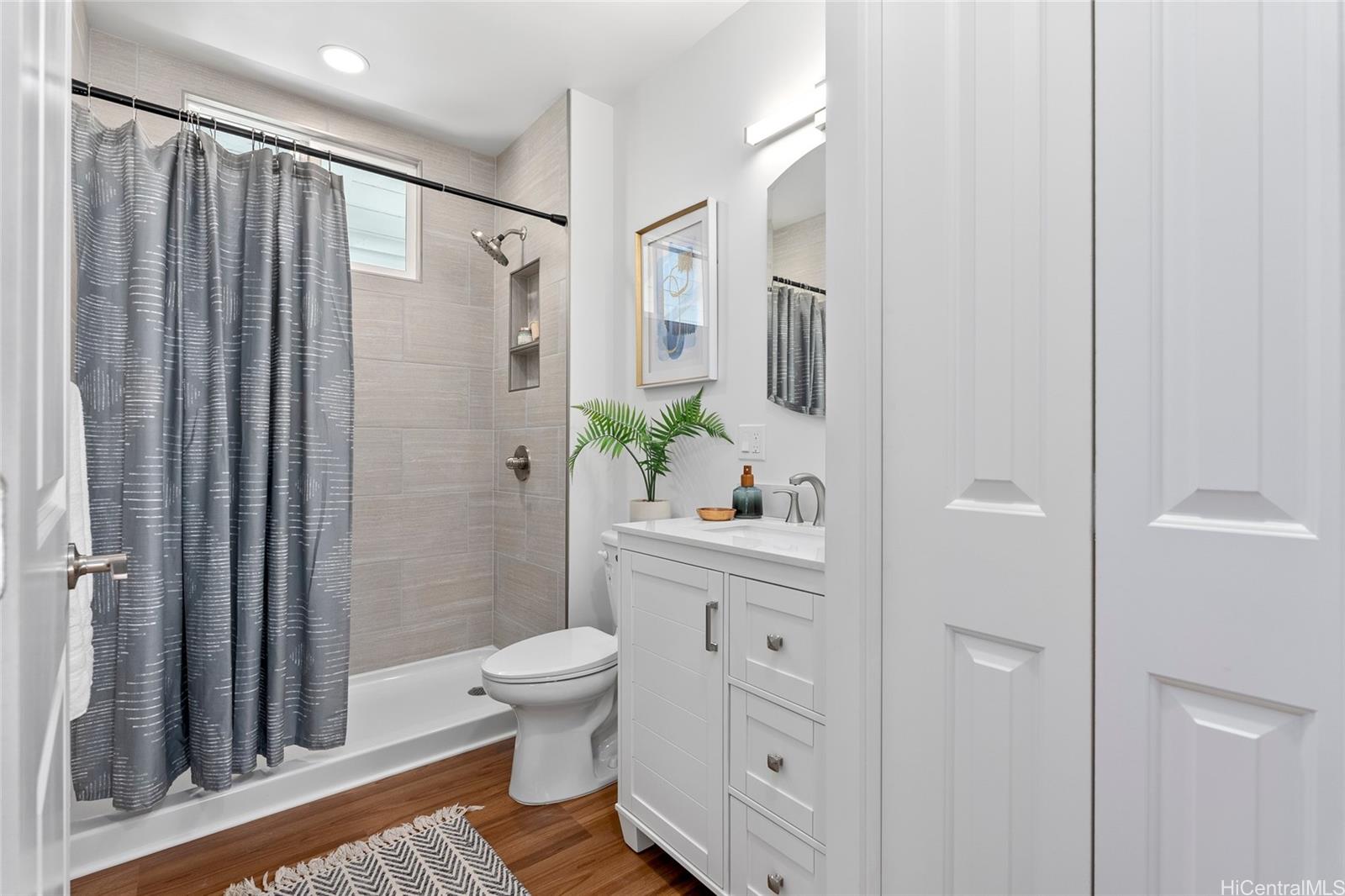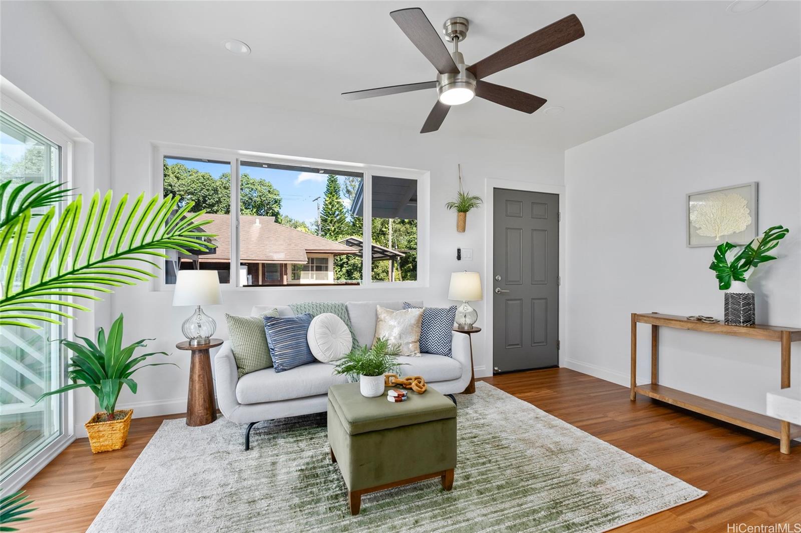 Welcome to 1281 California Ave #3, a fully renovated and redesigned 2bd/1ba home offering the feel of modern new construction with the charm of its original cottage style feel. Taken down to the studs and reimagined, this former home now features new exterior siding and trims, new windows, a new asphalt shingle roof, hurricane clips, full drywall, updated plumbing, and new electrical — essentially creating a modern home. The open-concept living area flows into a brand-new kitchen with stainless steel appliances, tile backsplash, new cabinetry, quartz countertops, and recessed lighting. Warm wood vinyl flooring runs throughout. The fully redesigned and renovated bathroom and large bedroom closets complete the interior. A new sliding door opens to a deck and fully fenced yard, plus a covered rear lanai for added living space. The enclosed two-car carport fits two full-size vehicles with room for storage. Set back from the street as the rear home down a private driveway, this property enjoys added privacy and a peaceful setting. No maintenance fees and an exceptional value in Wahiawa.