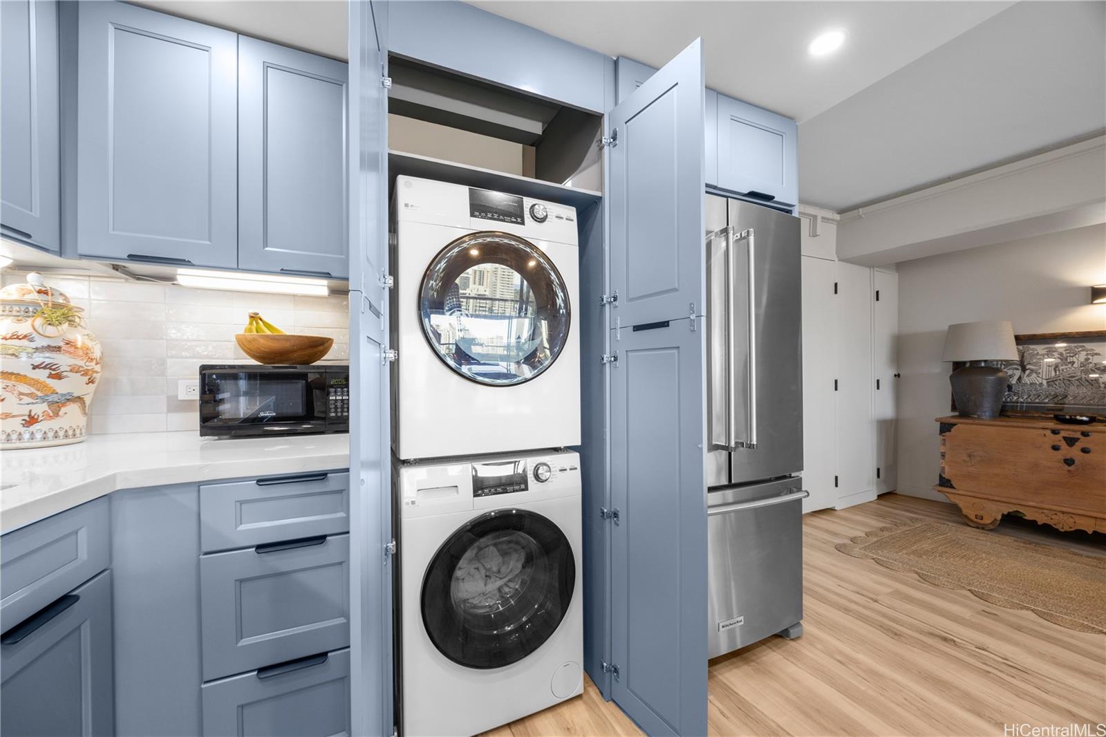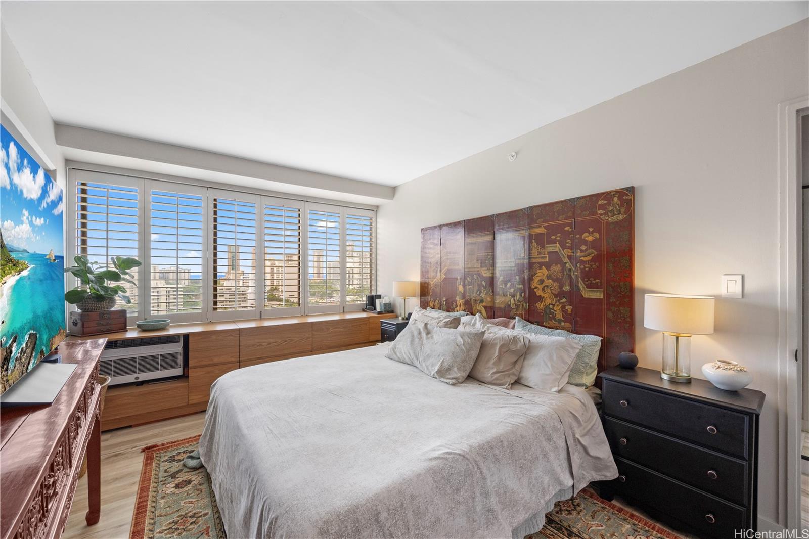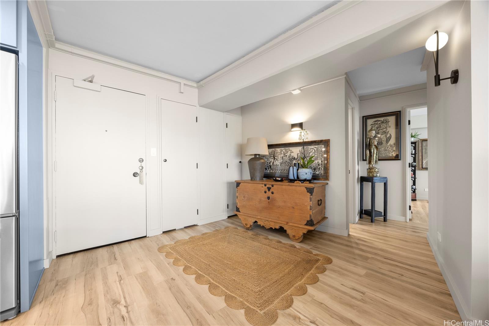 Beautifully renovated fee simple 2 bedroom, 2 bathroom apartment. Don't miss out on this highly desirable rarely available Marco Polo floor plan. Includes 2 COVERED PARKING STALLS, with extra storage. The bathroom plumbing project was recently completed with the installation of 2 water isolation valves. Vinyl flooring throughout and air conditioning in both bedrooms. The in-unit washer/dryer, recess lighting, quartz counter tops and stainless steel appliances tastefully add to the meticulously detailed and designed open planned kitchen. A large living room for relaxing and entertaining leads to a spacious, private lanai with panoramic ocean, park, and Waikiki city views. Perfect for watching the spectacular Hawaiian sunsets and enjoying Friday evening fireworks.