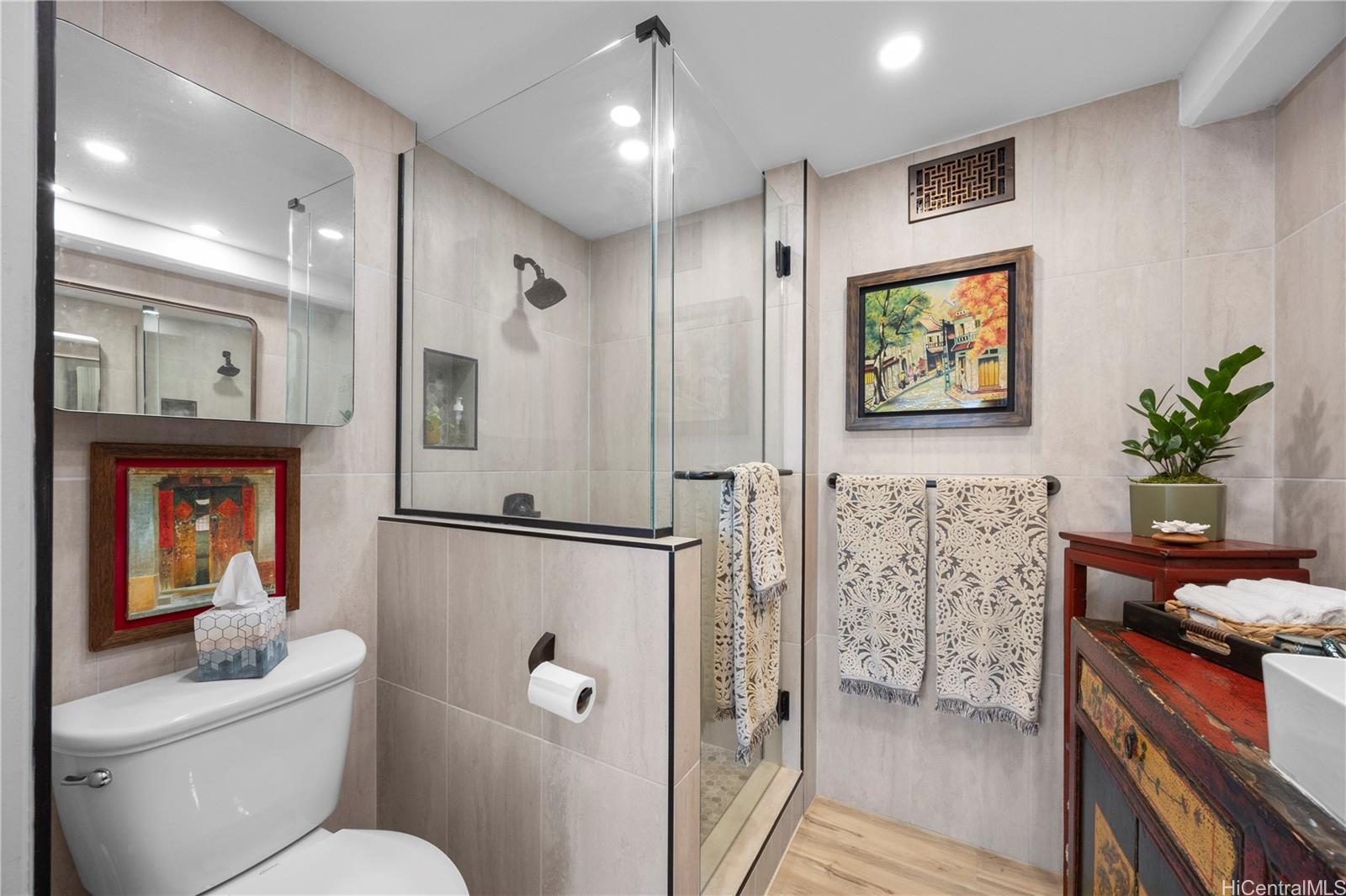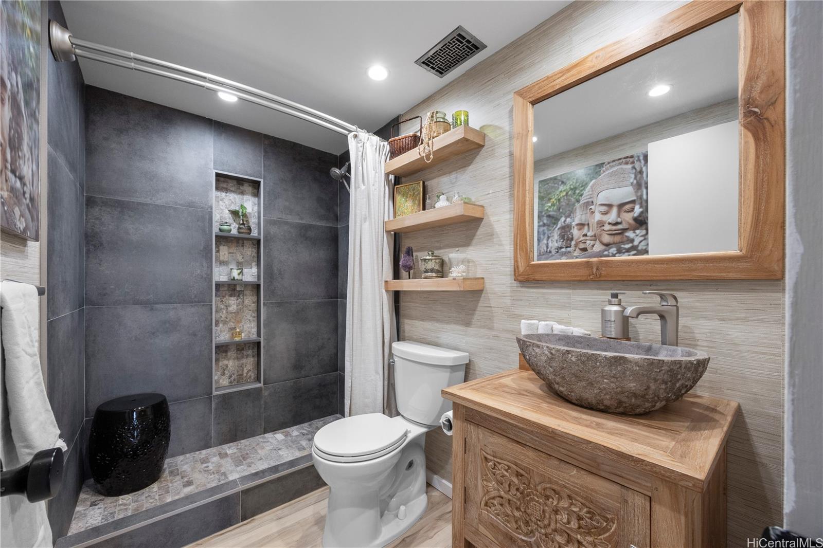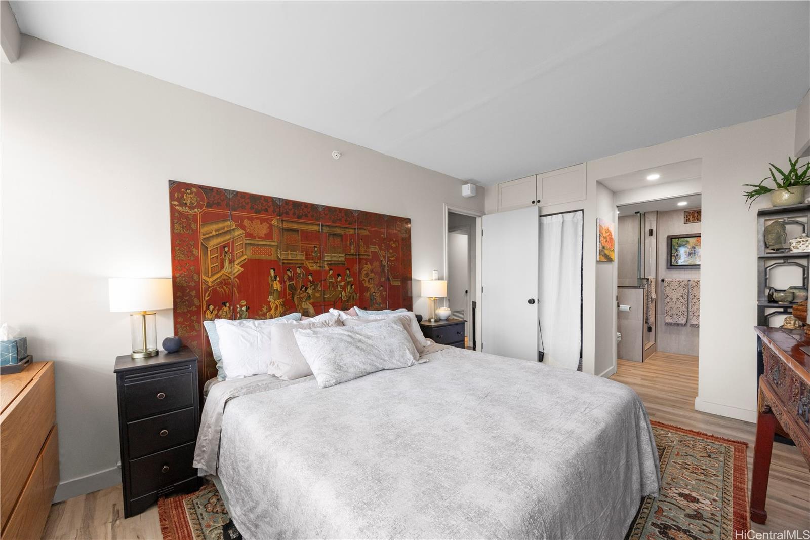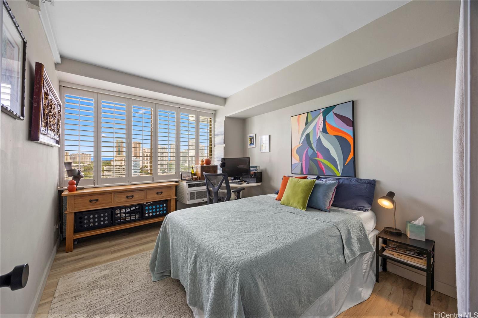 Beautifully renovated fee simple 2 bedroom, 2 bathroom apartment. Don't miss out on this highly desirable rarely available Marco Polo floor plan. Includes 2 COVERED PARKING STALLS, with extra storage. The bathroom plumbing project was recently completed with the installation of 2 water isolation valves. Vinyl flooring throughout and air conditioning in both bedrooms. The in-unit washer/dryer, recess lighting, quartz counter tops and stainless steel appliances tastefully add to the meticulously detailed and designed open planned kitchen. A large living room for relaxing and entertaining leads to a spacious, private lanai with panoramic ocean, park, and Waikiki city views. Perfect for watching the spectacular Hawaiian sunsets and enjoying Friday evening fireworks.