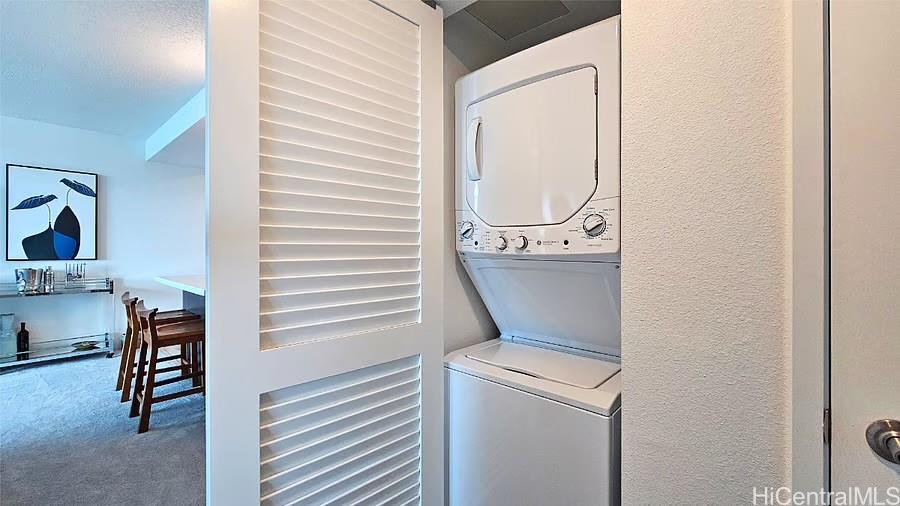 complemented by the carpeting, white walls, and modern layout of the kitchen. An in-unit washer/dryer adds everyday