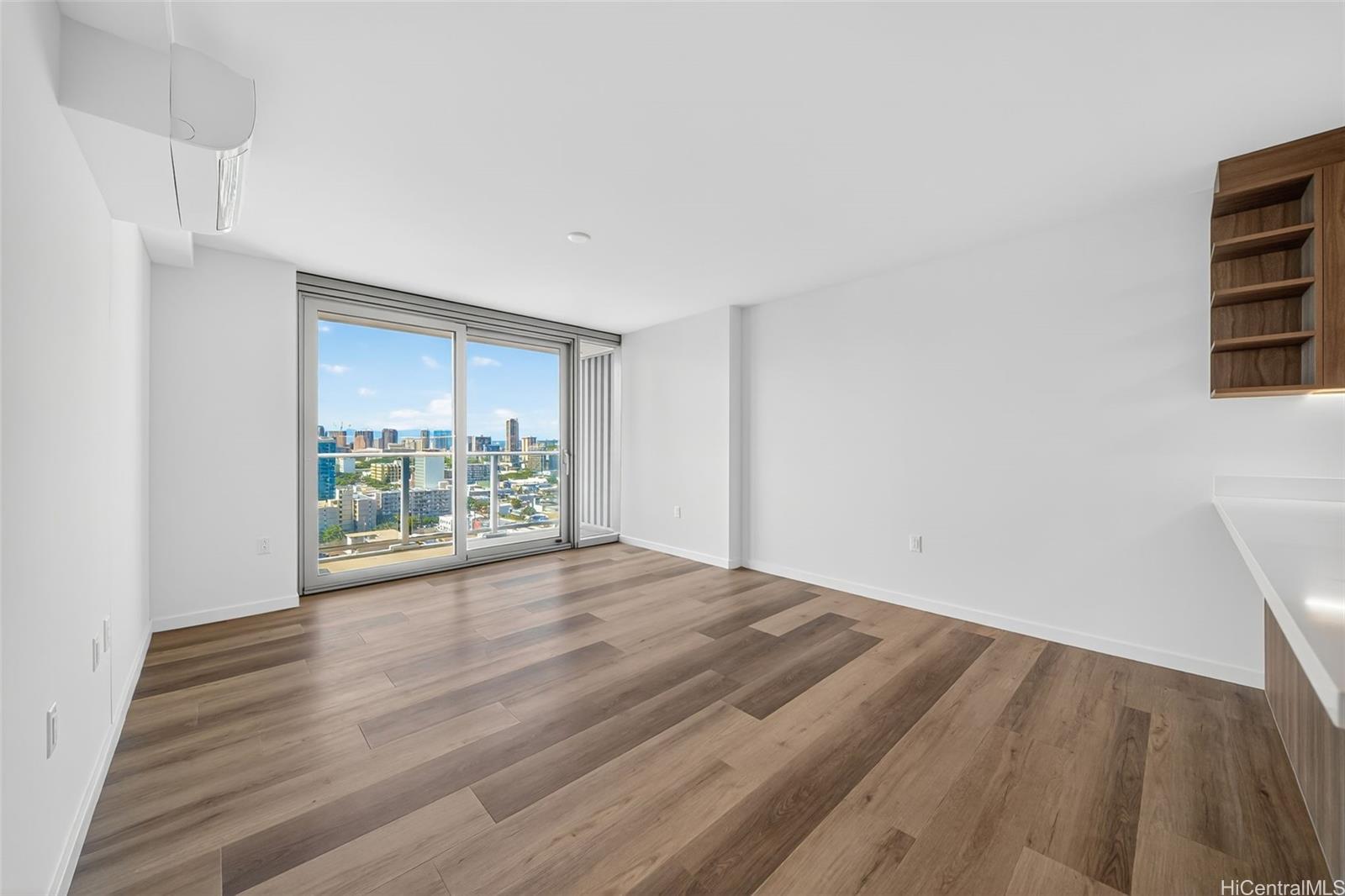 This one-bedroom residence offers the city views along with expansive floor-to-ceiling windows that fill the space with natural light. The open-concept layout features quartz countertops, luxury vinyl plank flooring in the living areas and kitchen, split AC in every room, and a private lanai to take in both city and ocean vistas.