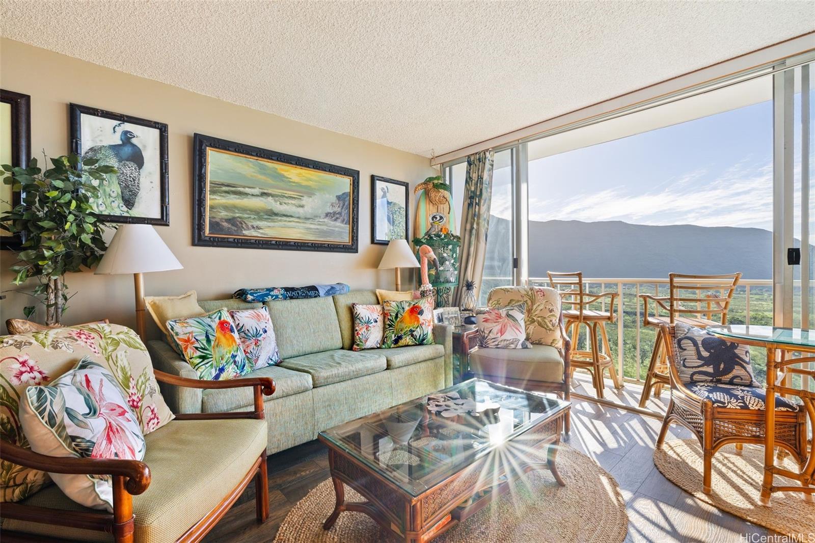 RARE 3.625% VA ASSUMABLE LOAN OPPORTUNITY!! Enjoy resort-style living in the gated community of Makaha Valley Towers. Located in the peaceful Makaha near stunning beaches and scenic hiking trails, this spacious 1-bedroom, 1-bath, 1-parking condo offers sweeping ocean and mountain views in a serene setting. From the moment you enter, floor-to-ceiling glass doors showcase panoramic ocean views and flood the home with natural light. The primary bedroom includes a flexible bonus space, ideal for an office area. Updated wood laminate flooring (2022) and a secure entry storage closet add comfort and convenience for island living. Residents enjoy a heated pool, BBQ area, community laundry on every floor, gated entrance and nearby ample guest parking. Maintenance fees include electricity, AC, water, sewer, basic internet, cable and 24-hour security, offering exceptional value and peace of mind. All furnishings are included at the buyer's option, making this a truly move-in ready opportunity. 3.625% VA loan assumption available to veteran buyer with full price offer (PITI $1,264.08, HOA $1,210.55, Loan Balance $198,865). Buyer to verify and qualify.