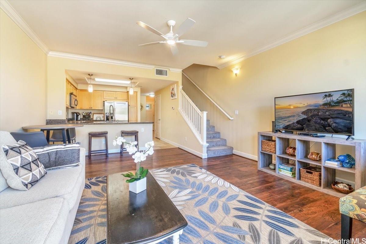 *** First Sunday Open House, Feb 1, from 10 - 12 *** Rarely available perimeter location 2 bedroom, 2.5 bath Ko Olina Hillside Villas townhome. Privacy from this location, as it does not face another building. This bright & cheerful home has upgraded laminate floors, central air-conditioning, granite counter tops, stainless steel appliances, & crown molding. Fully furnished & move-in ready! Perfect as a full-time home, holiday getaway or rental investment property. Minimum 30-day rentals allowed. Spend your days relaxing at Ko Olina's beautiful sandy beaches, snorkeling, paddle boarding, & golfing. Discover wonderful dining & shopping options nearby! Enjoy living the resort life at Ko Olina!