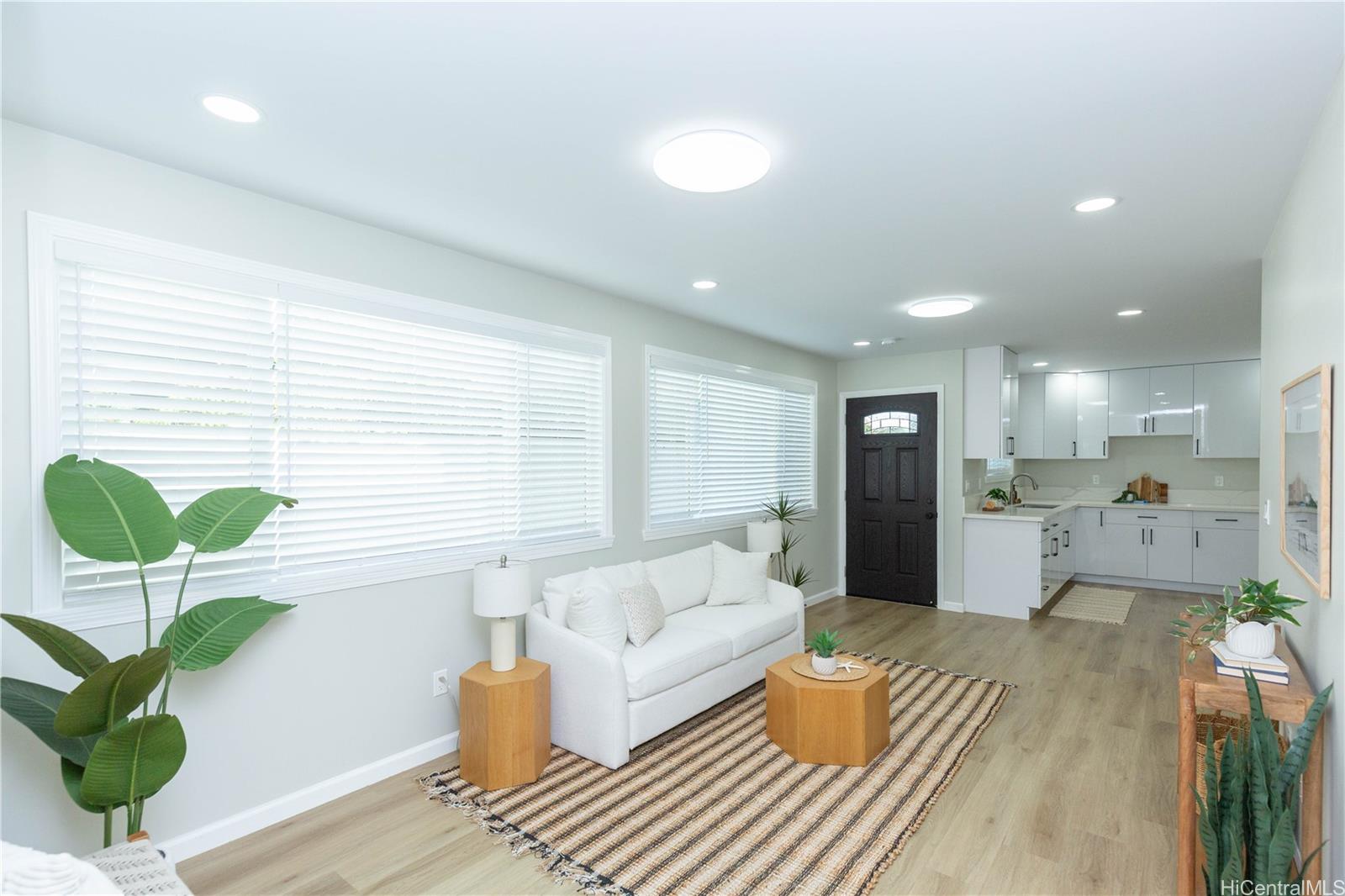Built in 2024, this beautiful 6 bedroom, 3 bathroom attached single family home is located Ewa Beach. This home has 2 living rooms, and a full wet bar on the first floor (can be converted into a full kitchen). The kitchen features quartz counter tops, custom floor to ceiling cabinets, stainless steel appliances. 8 split A/Cs in both living rooms and all bedrooms. Luxury Vinyl plank flooring throughout the entire house, solar water heater, gutters, and a vinyl fence. Conveniently located to shops, gas station, school and the Ocean. Ocean access across the street.