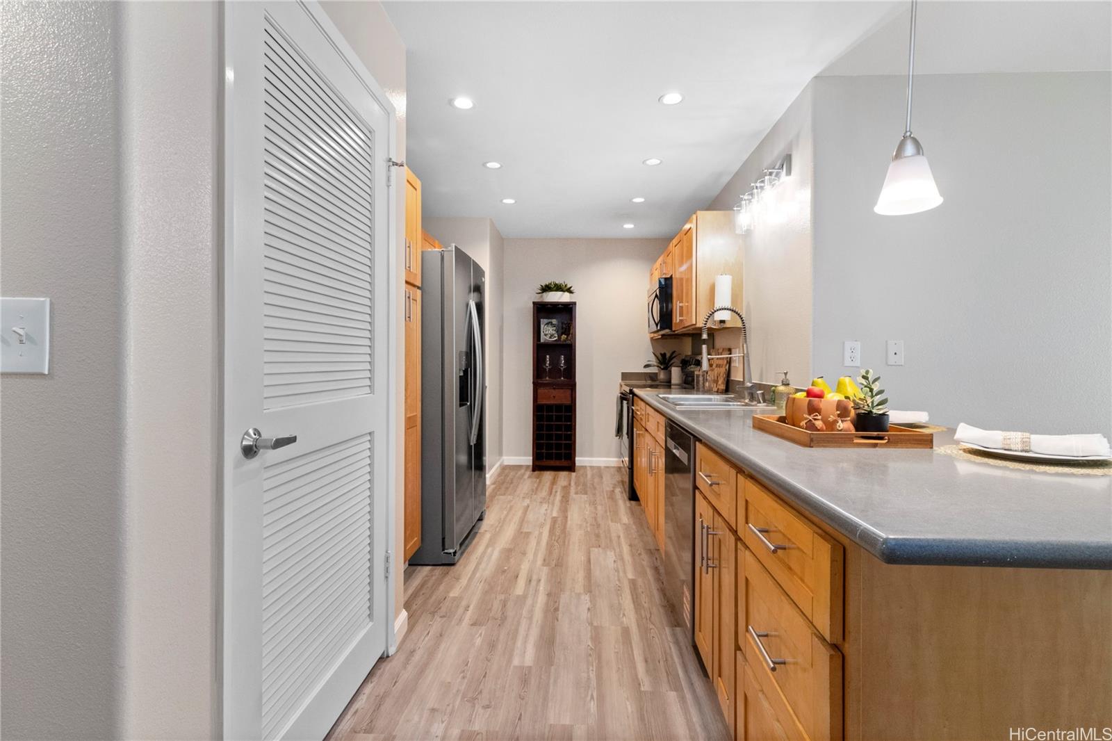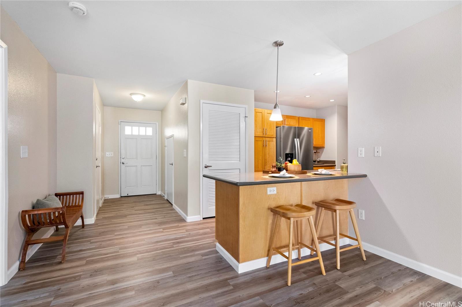 Discover the perfect blend of modern living and convenience in this townhome. Featuring two spacious bedrooms and two well-appointed bathrooms, this home boasts new luxury vinyl plank flooring and fresh paint throughout, providing a welcoming atmosphere. The open floor plan seamlessly connects the living, dining, and kitchen areas, making it an ideal space for entertaining or simply enjoying a relaxed lifestyle. Storage is abundant, with a primary bedroom that includes a large walk-in closet, ensuring that all your essentials are neatly organized. Step outside to the covered lanai, where you can unwind in your generous fenced yard—perfect for outdoor gatherings or quiet moments in nature. This townhouse is not just a home; it’s a lifestyle, with access to the Villages of Kapolei recreation center and pool, offering additional leisure and fitness options right at your doorstep. Located in a prime area, this property is just moments away from schools, shopping, and entertainment, with easy freeway access for your commuting needs. Includes a single-car garage and additional parking. You will not want to miss the opportunity to make this exceptional property your own!