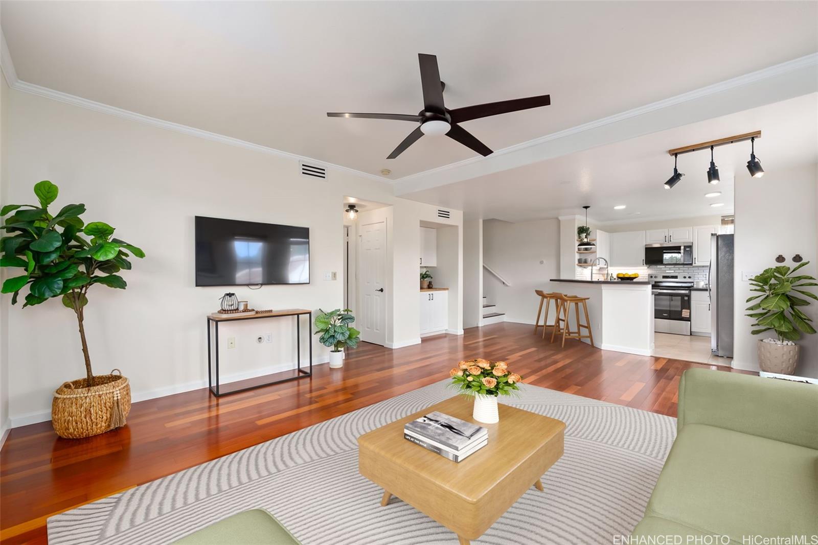 Welcome to this beautifully refreshed, corner-end residence in the highly desirable East Honolulu community of Nanea Kai. This well-positioned home offers breathtaking views of iconic Koko Head with no side neighbor, providing enhanced privacy, abundant natural light, and refreshing trade wind breezes. The spacious 1,461 sq. ft. interior features 3 bedrooms and 2.5 bathrooms, complemented by beautiful hardwood floors, fresh interior paint, new stainless-steel appliances, updated light fixtures, and central air conditioning with Nest controller. Nanea Kai is a special complex in Hawaii Kai with recently reduced maintenance fees. Ideally located within an International Baccalaureate school district and just minutes from Costco, Safeway, local eateries, parks, hiking trails, Hawaii Kai Marina, and nearby beaches. Priced under $1M, this property presents an excellent opportunity to own a home in Hawaii Kai at exceptional value. Some photos have been virtually staged/enhanced.