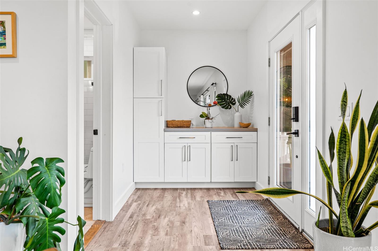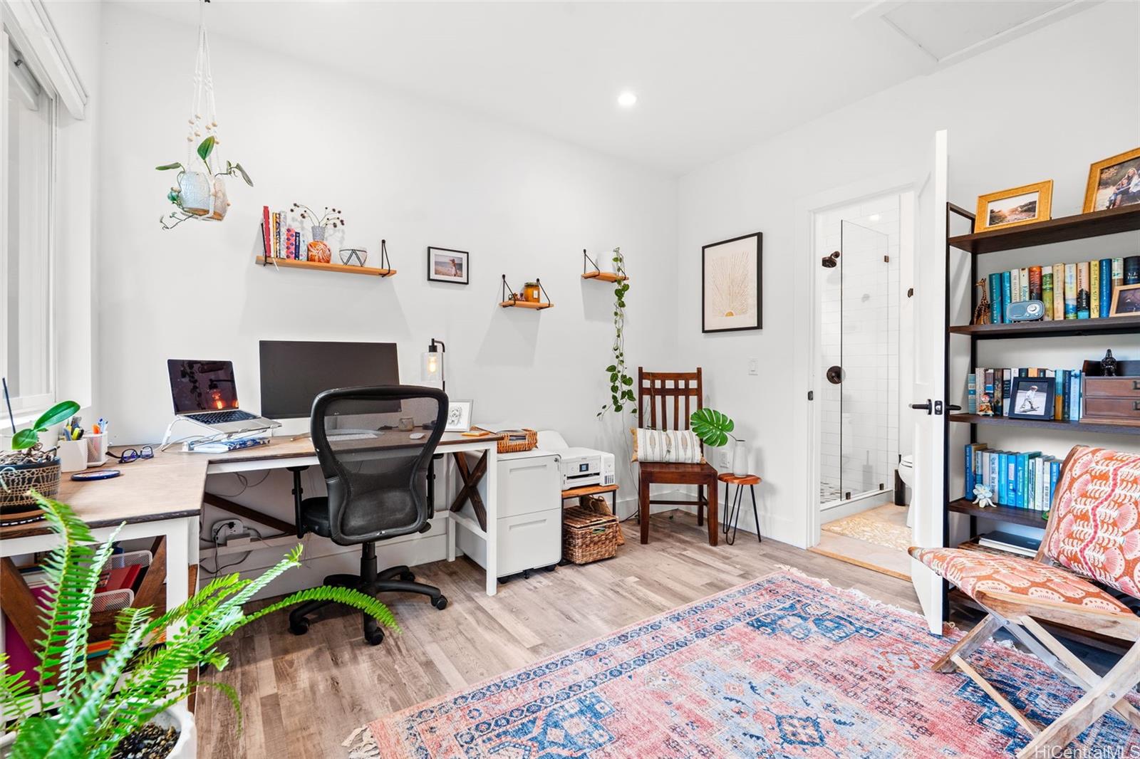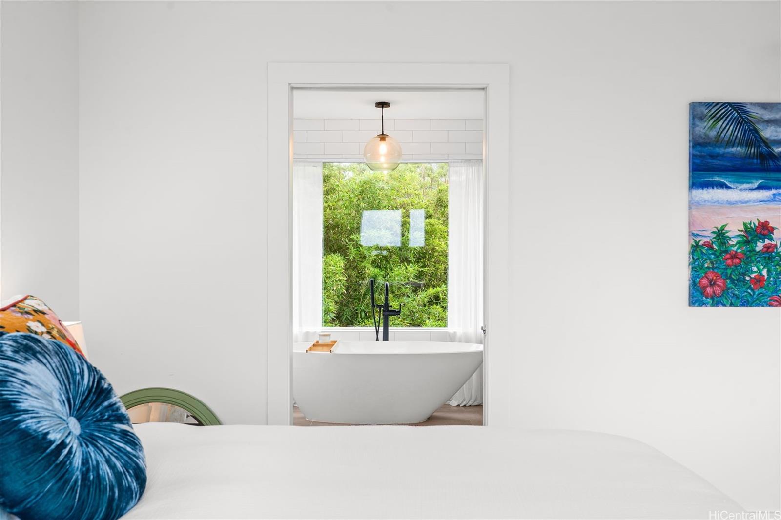 A large wraparound lanai anchors the home, creating a seamless indoor-outdoor connection. Ideal for entertaining or quiet moments alike, the lanai features a dedicated outdoor dining area with a full dining table, surrounded by integrated tropical planting that enhances privacy while framing the dramatic ocean backdrop. This expansive outdoor living space becomes a natural extension of the home—perfect for sunset dinners, morning coffee, and year-round enjoyment of the North Shore lifestyle.