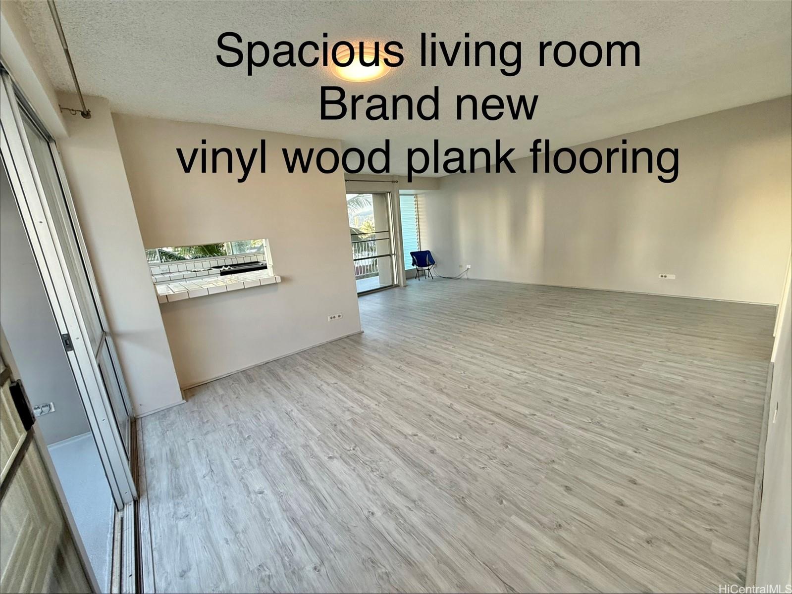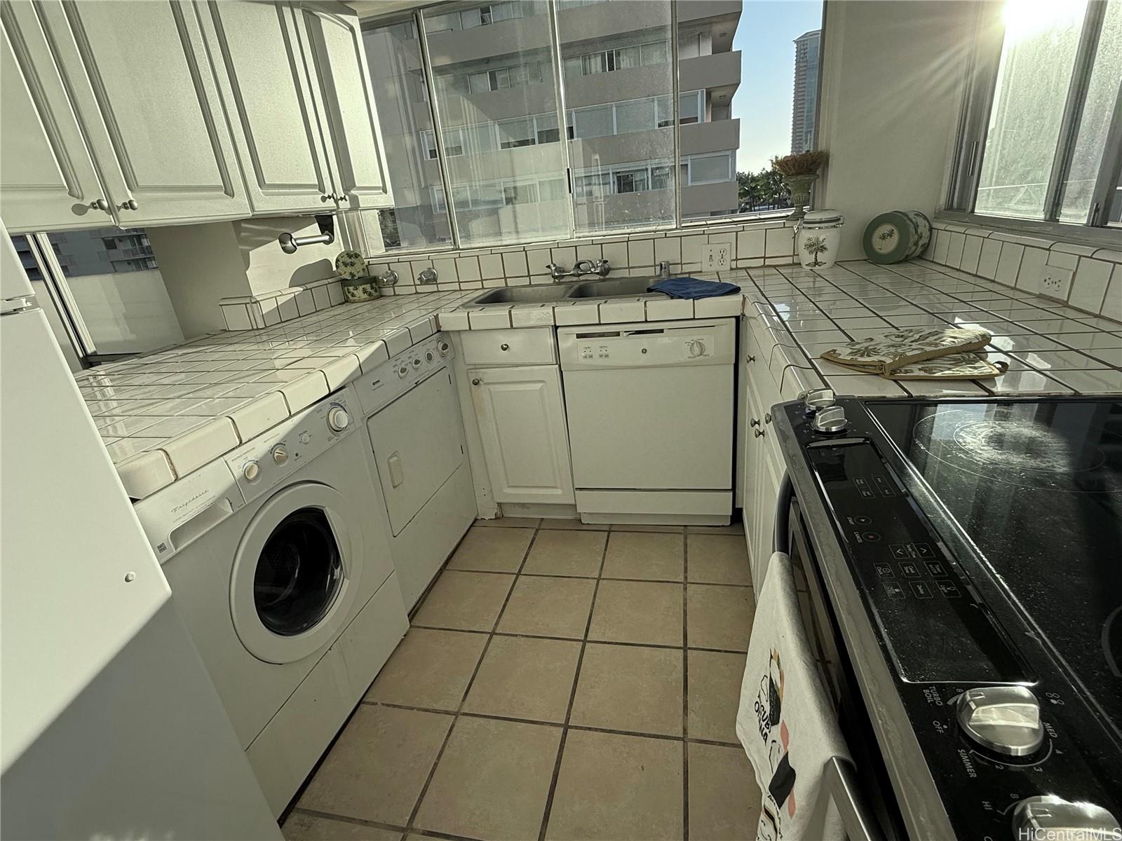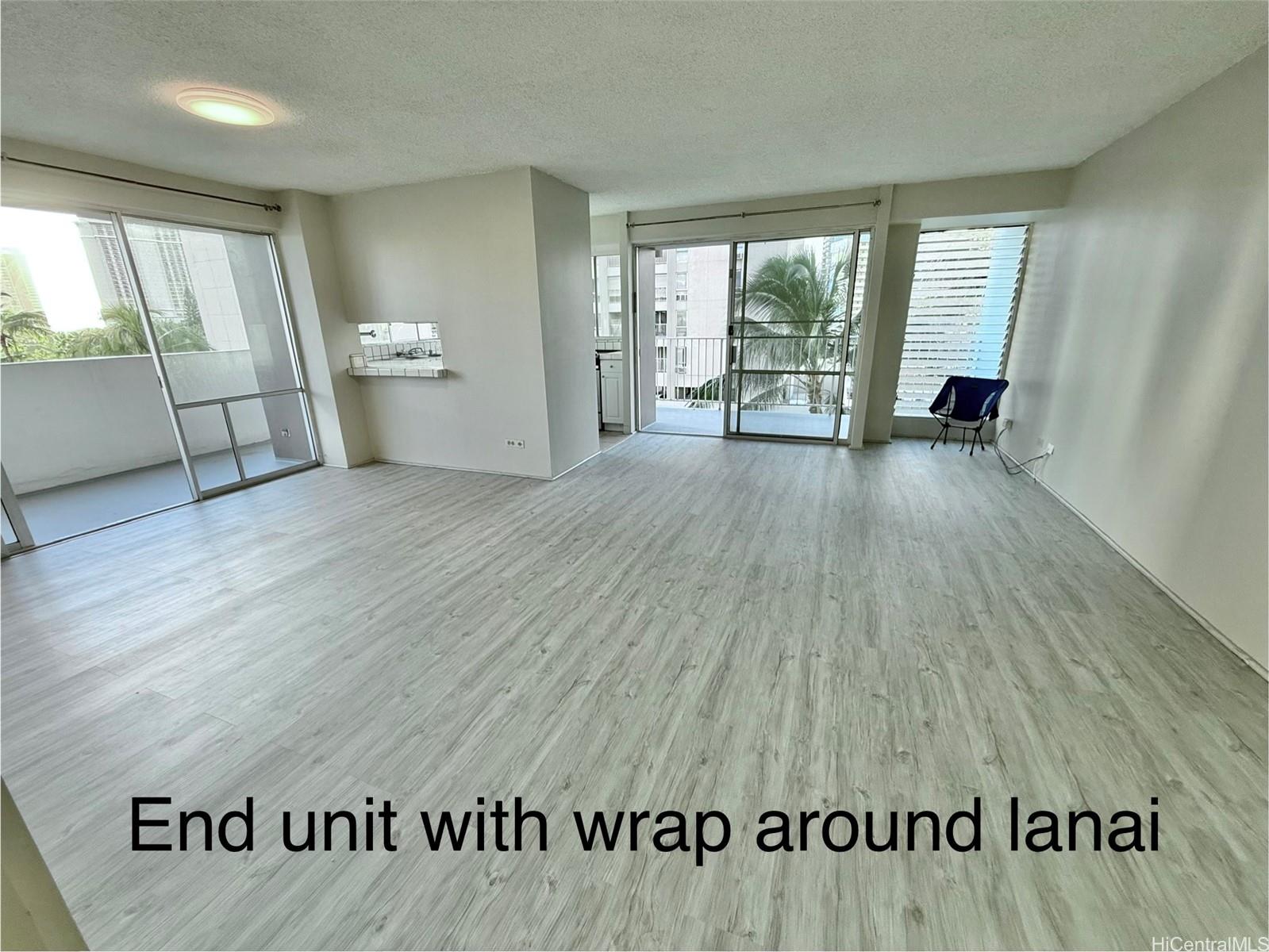 Quiet side street between Ala Wai Blvd & Kuhio Ave on the Ewa end of Waikiki. Relax & enjoy the palm tree views from the LARGE 316 sq.ft. wrap around lanai. Corner unit features NEW vinyl wood PLANK flooring, fresh paint, & one assigned covered parking stall #12. Bright & airy kitchen with lots of windows. Washer & dryer conveniently located in the unit.