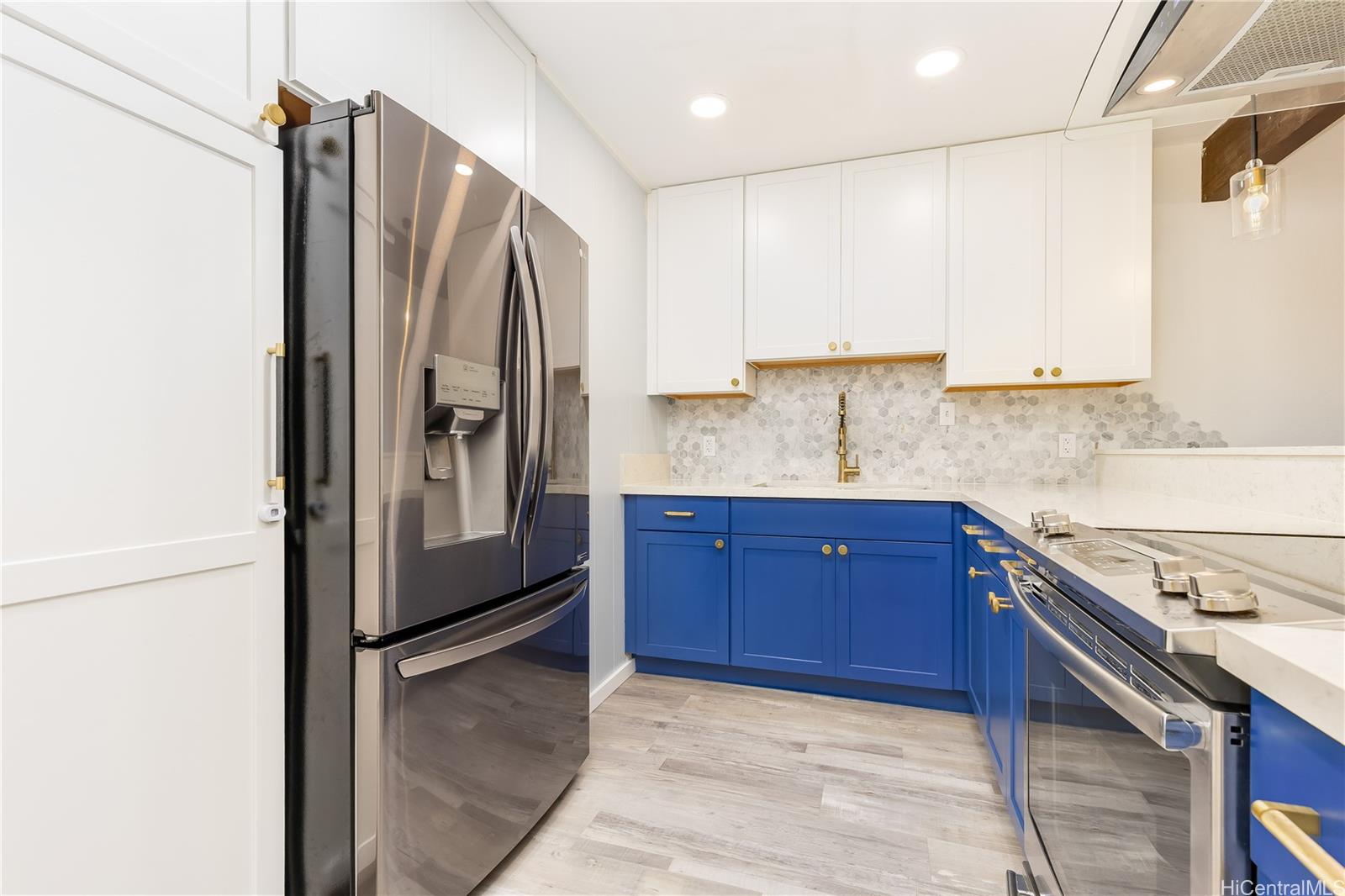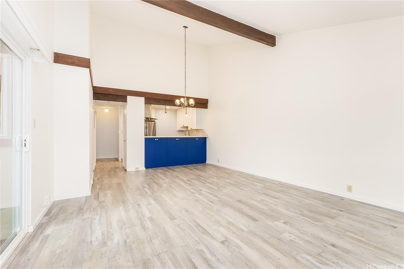 Welcome home to this beautifully updated 3-bedroom, 2-bath townhouse in the desirable Parkway Phase C-1 community of Kaneohe. This private corner-end unit features soaring vaulted ceilings with exposed wood beams, creating an open and airy living space filled with natural light. The thoughtfully renovated kitchen showcases crisp white upper cabinetry, bold blue lower cabinets, quartz countertops, stainless steel appliances, and modern finishes that flow seamlessly into the dining and living areas—ideal for both everyday living and entertaining. Enjoy indoor–outdoor living with a spacious covered lanai, perfect for relaxing or hosting, while taking in peaceful Windward surroundings. Split air conditioning in the primary bedroom adds year-round comfort. The home includes two assigned parking stalls (one covered), with additional guest and street parking available. Residents enjoy access to a private recreation center featuring a swimming pool, basketball and tennis courts, fitness center, and party/meeting room. A move-in-ready opportunity offering comfort, style, and convenience in the heart of Kaneohe. Some photos have been virtually staged/enhanced. FIRST OPEN HOUSE SUNDAY 1-4 PM