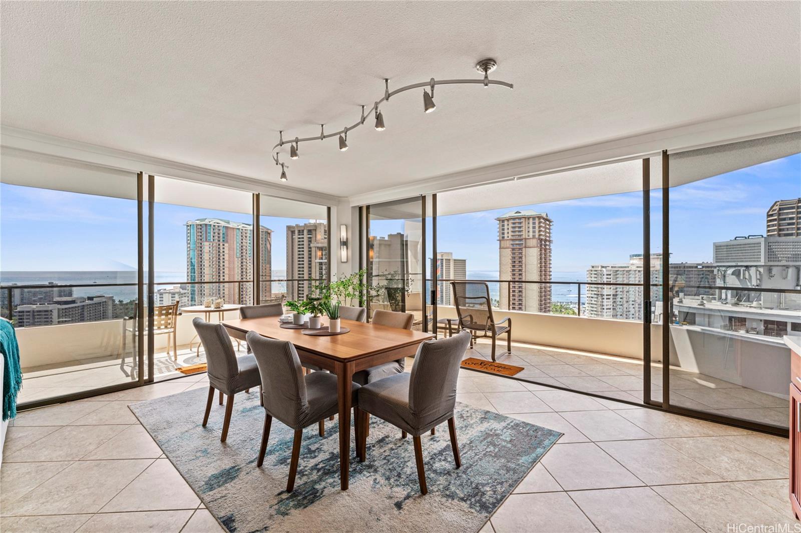 Enjoy fantastic ocean and Diamond Head views from this spacious 2-bedroom, 2-bath corner residence in a landmark building in Waikiki. This high-floor unit offers an extra-large wrap-around lanai, creating seamless indoor-outdoor living and a true “house in the sky” feel. Exquisitely remodeled, the home features quality finishes, a bright open layout, and motorized blinds for added comfort and convenience. Ideally located just minutes from world-famous beaches, dining, entertainment, and Ala Moana Shopping Center, this residence delivers the best of island living in the heart of Honolulu. Welcome to your piece of paradise.