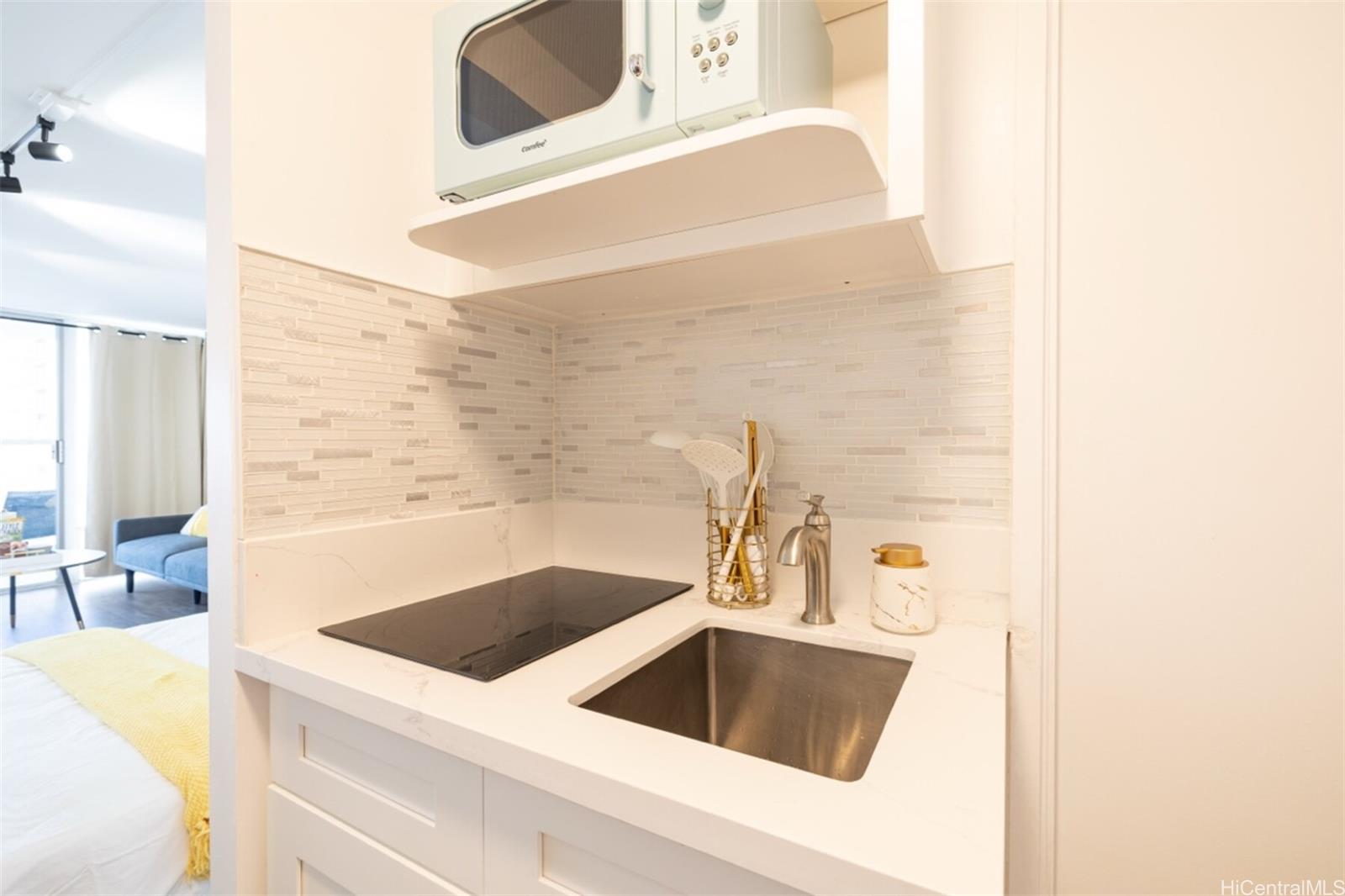 Beautifully renovated studio at Island Colony with stunning dual views of the Ala Wai Canal, mountains, and resort-style pool deck. This turn-key unit features a designer bathroom with vessel sink, gold fixtures, and elegant 3D wave tile shower. The updated kitchenette showcases quartz countertops, linear glass tile backsplash, induction cooktop, and modern cabinetry. Step onto your private lanai to enjoy morning coffee overlooking the canal or watch the sunset over Waikiki. Located in the heart of Waikiki with easy access to world-famous beaches, shopping, and dining. Island Colony offers exceptional amenities including pool, fitness center, and on-site management. Ideal for owner-occupants, investors, or those seeking a vacation getaway with strong rental income potential. Don't miss this opportunity to own a piece of paradise.