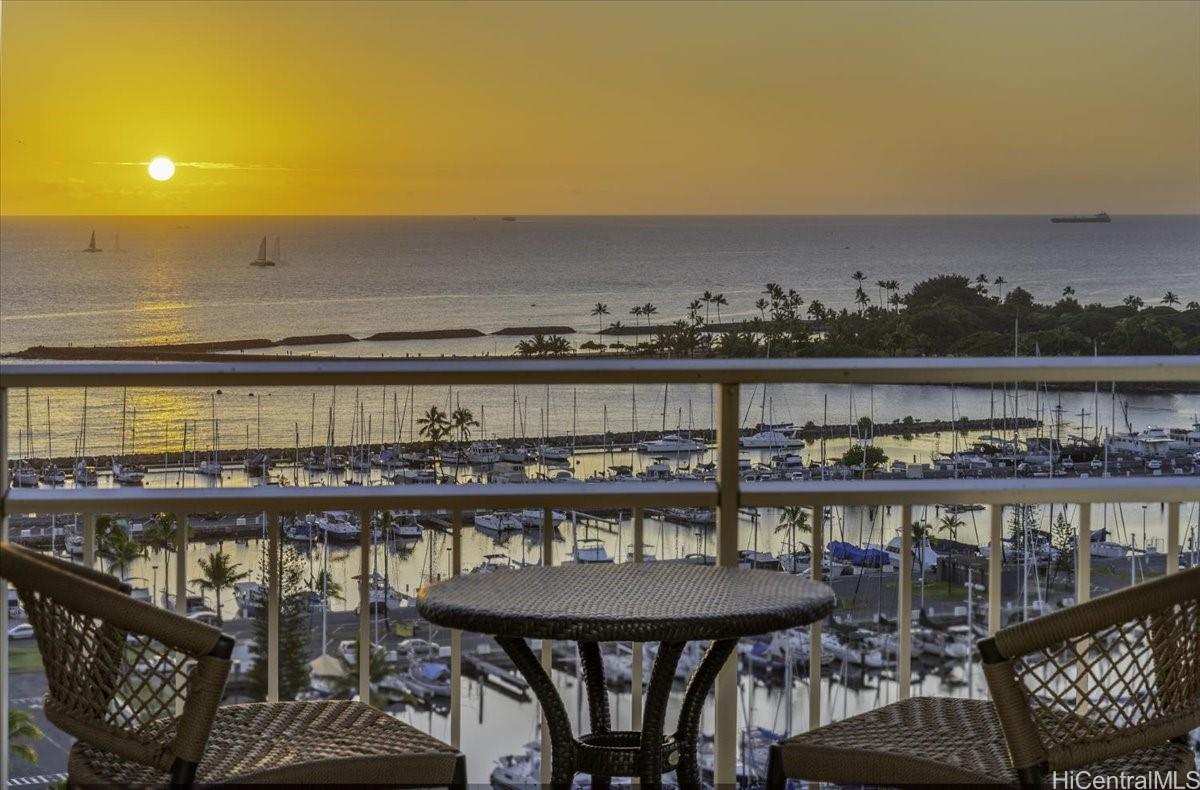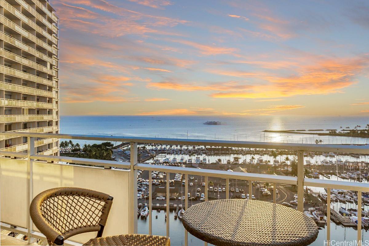 Live the Hawaiian Vacation Life year-round from this rarely available "10 stack unit" at the world-famous Ilikai Hotel. This upgraded preferred corner-end view unit, with direct parallel linear Pacific Ocean blue exposure, includes an extremely rare "grandfathered in" WASHER/DRYER inside. This 1000 SqFt Hawaiian retreat also features travertine floors throughout, pocket doors for each of the suites, ample closet spaces, ACs, granite counters, and more. Feel the mountain tradewinds flow through one of two patio lanais. Enjoy cooking from an open kitchen with a panoramic layout or simply dine at one of the tasty new restaurants or eateries after shopping at the variety of local craft vendors. Take a dip at the main or Baja pool, walk to the beach, or sip on your Mai-Tai while listening to the nightly live music under the tiki torches and the setting Hawaiian sun show. Stroll to nearby Ala Moana Magic Island, surf spots, mall, Waikiki Beach, & many other iconic venues from this landmark's prime location. The flexibility of this legal short-term rental (though never rented) offers the opportunity to rent it daily, long term, or simply claim it as your primary piece of paradise