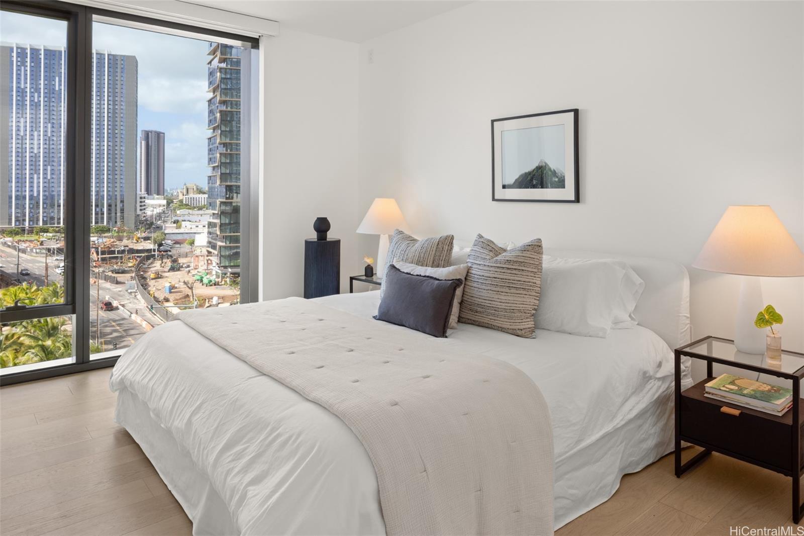New Turn-Key Listing at Victoria Place, Ward Village. Beautiful, fully-furnished 1-bedroom, 1-bath residence with one reserved parking stall, overlooking the lush amenity deck. Located in Victoria Place, the newest luxury building developed by Howard Hughes Corporation within the Ward Village master-planned community. The residence features custom cabinetry by Studio Becker, a Sub-Zero refrigerator, and Wolf gas range, oven, and microwave. This 350-unit front-row development was designed by Solomon Cordwell Buenz and offers resort-style amenities, including lap and lounge pools with ocean views, a wine cave, spa, hot and cold plunge pools, fitness center, movie theater, and 24/7 concierge and valet services.