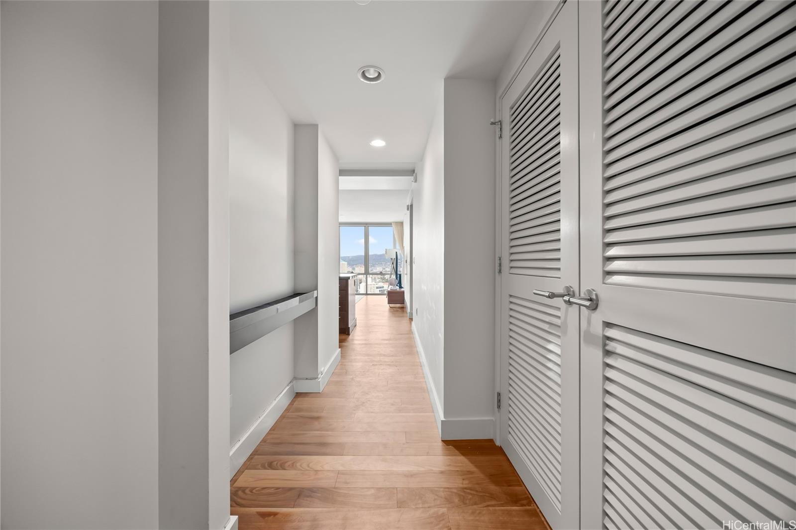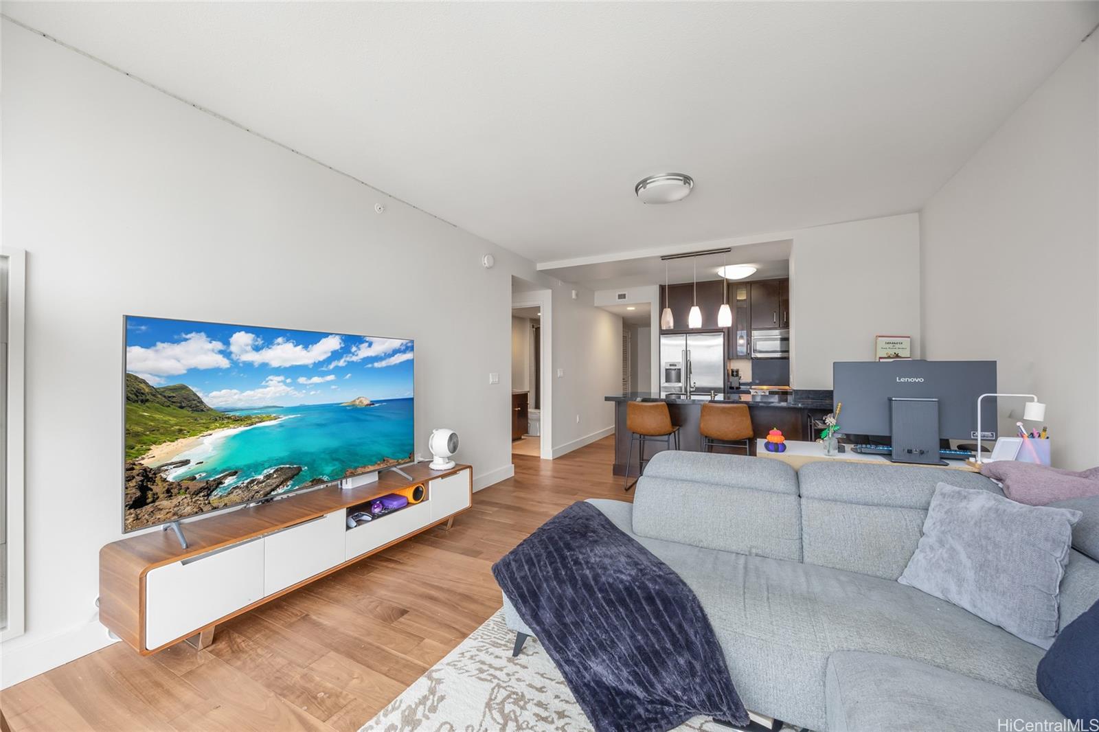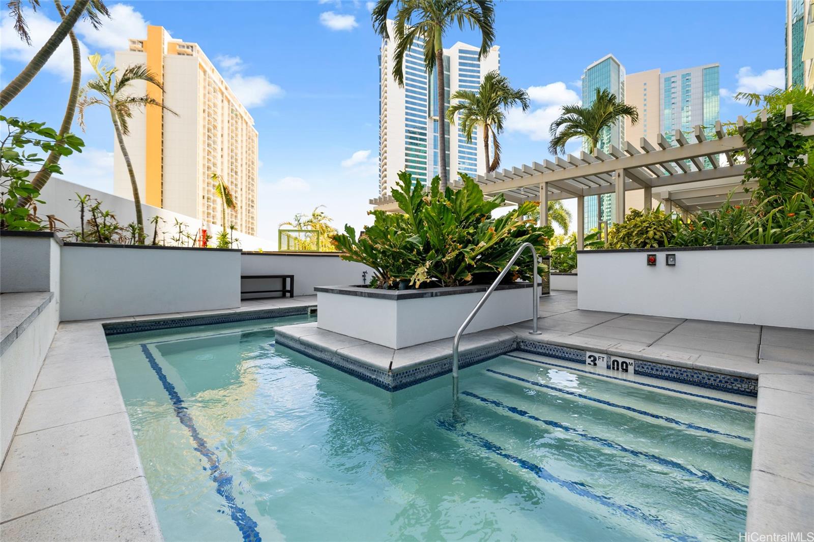 Experience the pinnacle of urban living in this rarely available high-floor residence at Waihonua. Perched on the 40th floor, this sleek 1-bedroom, 1-bathroom home offers breathtaking, unobstructed vistas of the Honolulu skyline and the majestic Ko‘olau Mountains. The interior reflects modern elegance with floor-to-ceiling windows, rich hardwood flooring, and a gourmet kitchen featuring polished granite countertops and premium Bosch stainless steel appliances. Unlike many urban units, this residence offers the ultimate convenience: one dedicated parking stall and a private storage locker. Resort-Style Amenities Living at Waihonua means access to a private club-style environment. The 6th-floor recreation deck is your personal playground, featuring.