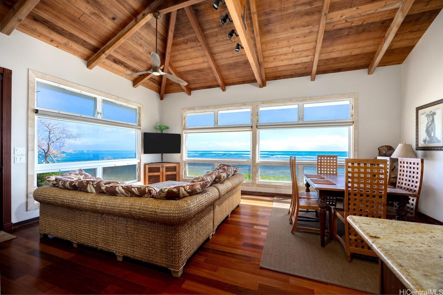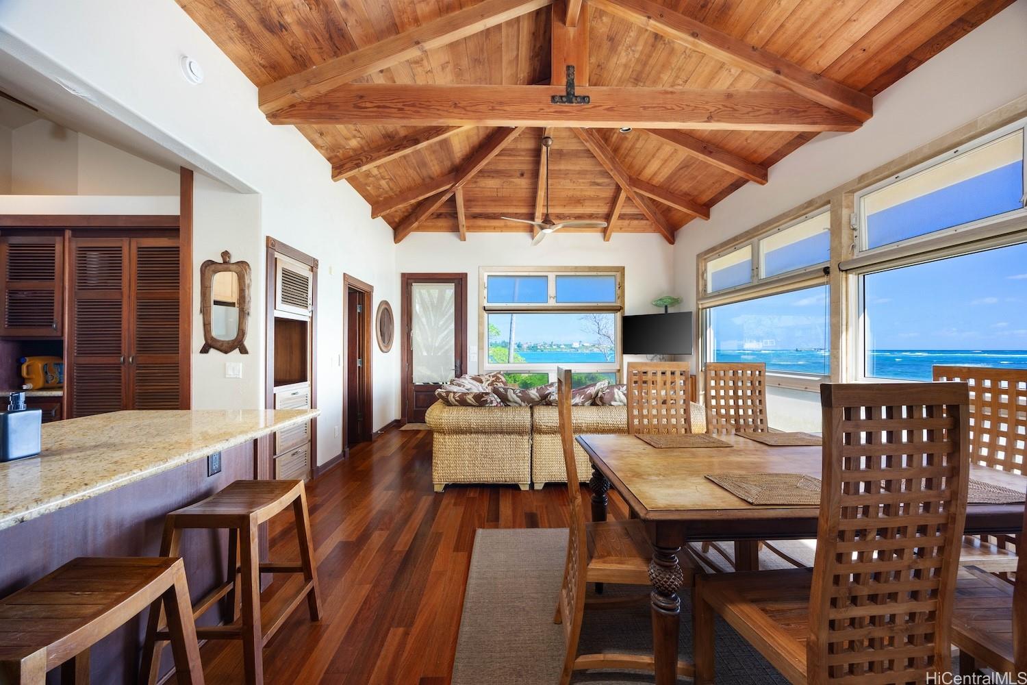 An exceptionally rare North Shore beachfront retreat. This virtually private, sandy beachfront property is one of only a select few where calm, crystal-clear waters meet the shoreline - ideal for daily swimming, fishing, and surfing just steps from your door. Despite its peaceful, secluded feel, the home is moments from everyday conveniences, including shopping centers with groceries, medical offices, dining, a theater, BYU–Hawaii, and some of Oahu’s most beautiful white-sand beaches. The main residence at 55-373 Kamehameha Hwy was thoughtfully renovated in 2010, showcasing solid Brazilian hardwood floors and travertine tile throughout. The second home, 55-373A, was newly constructed in 2014 and complements the original with matching finishes and design continuity. Both residences feature vaulted ceilings, unobstructed ocean views, private beach access, and impeccable upkeep, offering a rare opportunity to own a true beachfront compound on the North Shore.