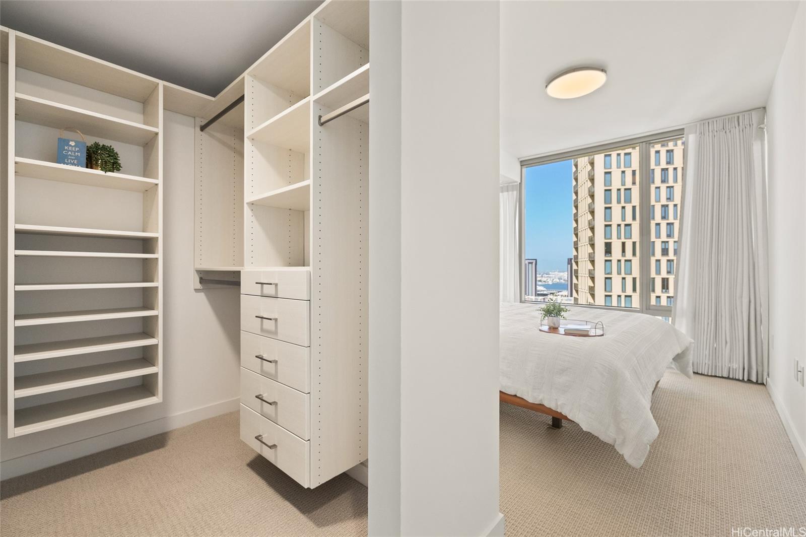 PRISTINE, HIGH-FLOOR, LARGEST 1/1 home at Ae'o with ocean, mountain/city views! This turn-key unit has Bosch stainless steel appliances, engineered hardwood floors, large laundry space, built-in closet system and motorized window treatments. List includes inspiration and Shari Saiki high-end furniture. It has a full-size parking stall on the 3rd floor. Resort-like amenities include a 24/7 hosted front desk, lap and family pools, whirlpool, fitness center, locker rooms with a sauna and steam room, theater, playground, guest suites, outdoor BBQ/dining cabanas, dining and media rooms with a chef's kitchen. Ae'o has direct access to the largest 2-level Whole Foods Market in Hawaii. Experience urban lifestyle in paradise with numerous dining & shopping options, Ala Moana Beach Park, Ward Theaters, Ala Moana Shopping Center, all in close proximity. Condo is currently vacant and easy to show.