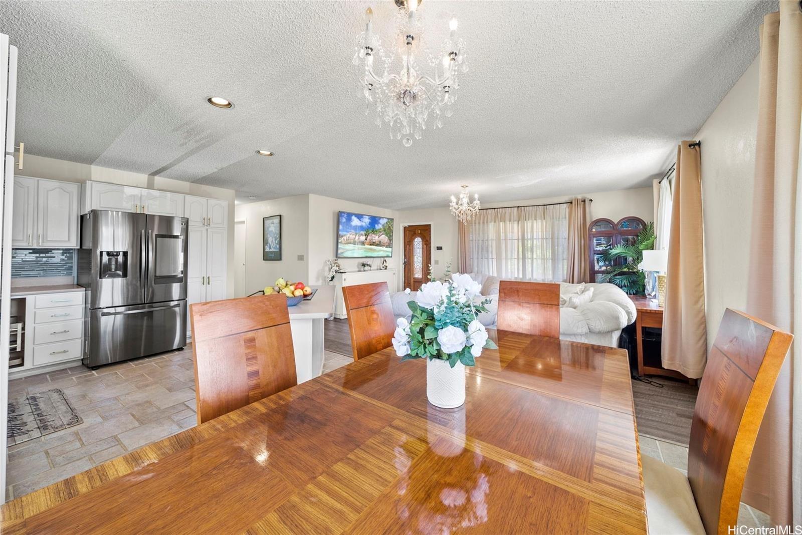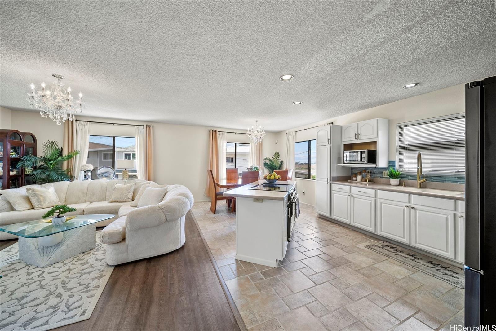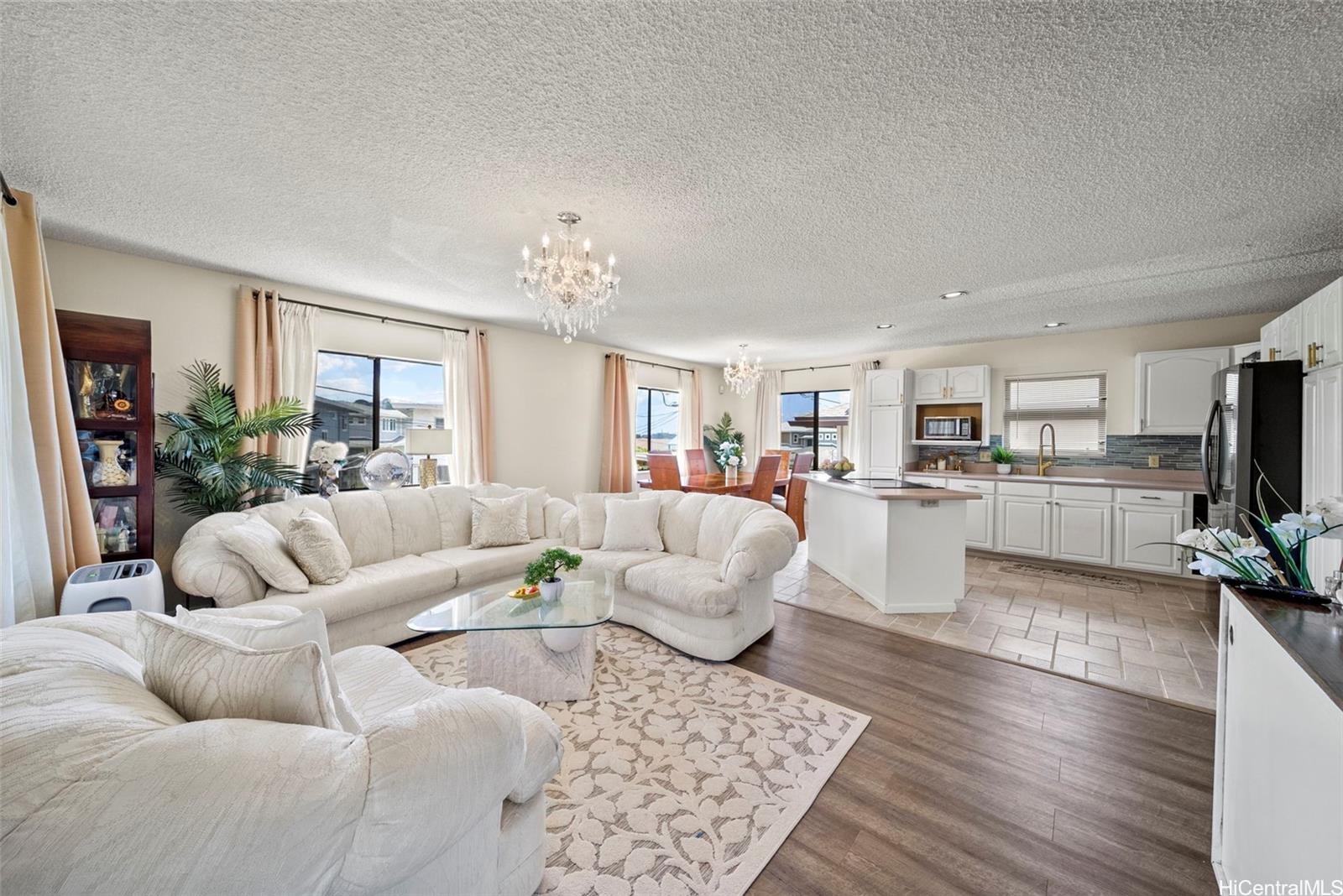 This versatile two-level home offers a flexible layout ideal for modern living. The upper floor features an open-concept kitchen, dining, and living area filled with natural light, along with a spacious primary bedroom that includes a large versatile room—perfect for use as a walk-in closet, office, or flex space—and an en suite bath with a double vanity. A second bedroom and full bathroom complete the upper level. The lower level offers two additional bedrooms, a full bath, a comfortable living area, and a convenient kitchenette—ideal for guests or multi-generational living. A large driveway and two-car garage provide ample parking, while scenic views of Kaneohe Bay and the surrounding mountains enhance this inviting home in the desirable Waikalua neighborhood.