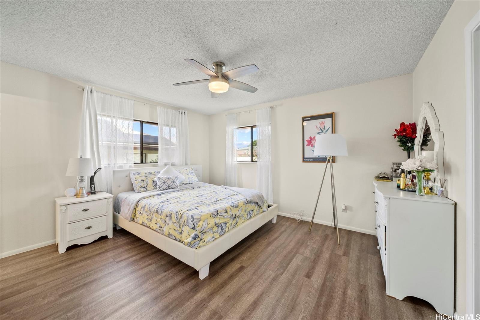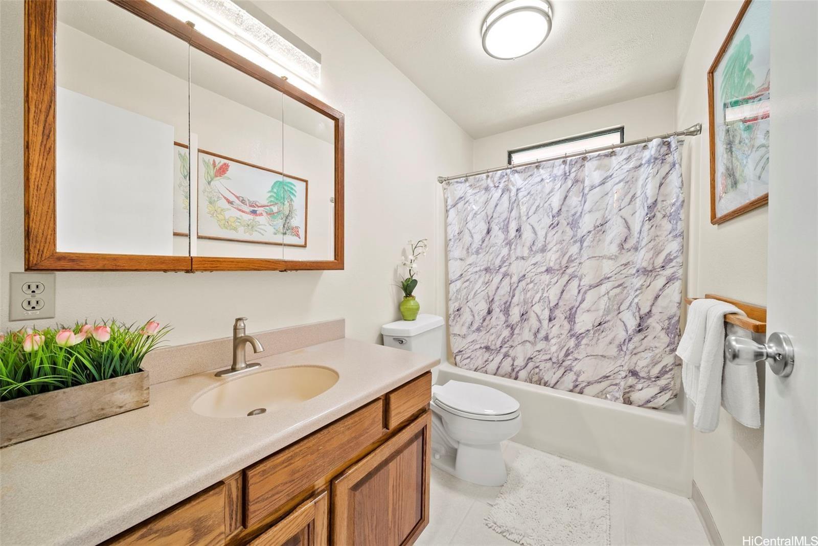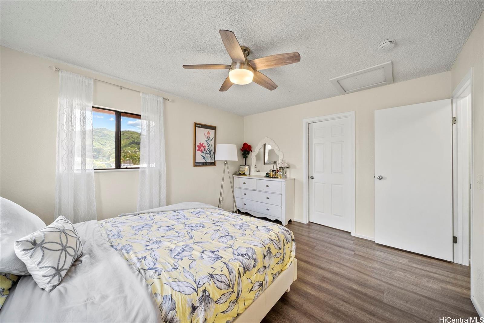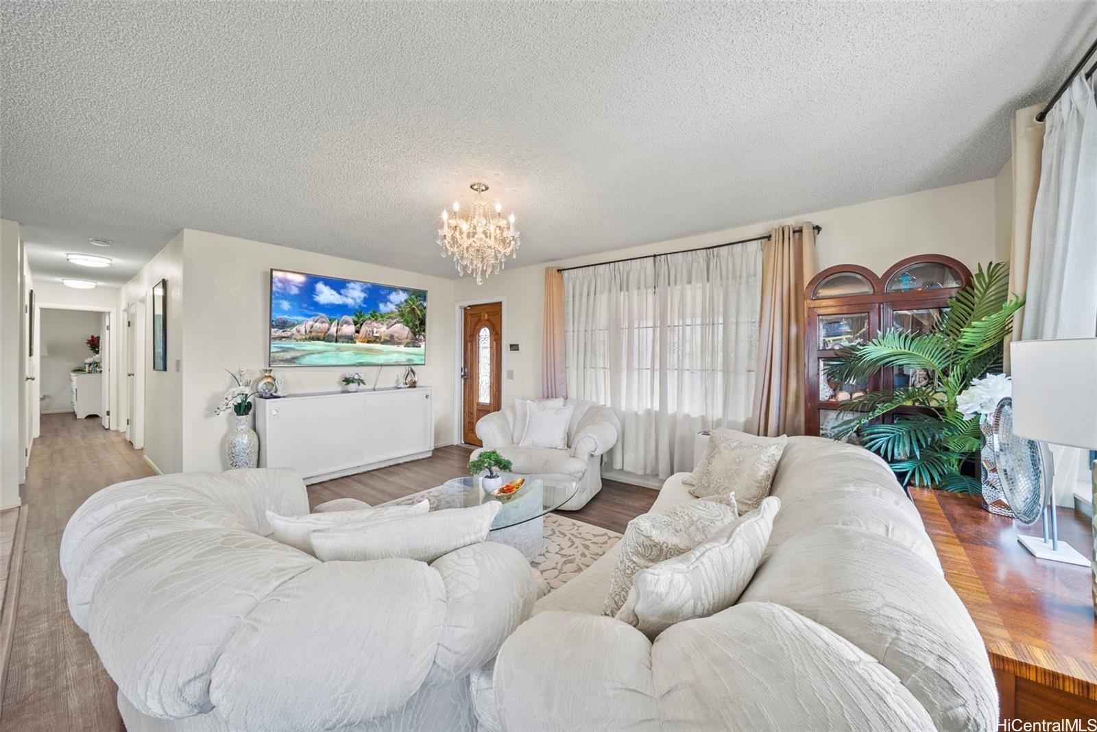 This versatile two-level home offers a flexible layout ideal for modern living. The upper floor features an open-concept kitchen, dining, and living area filled with natural light, along with a spacious primary bedroom that includes a large versatile room—perfect for use as a walk-in closet, office, or flex space—and an en suite bath with a double vanity. A second bedroom and full bathroom complete the upper level. The lower level offers two additional bedrooms, a full bath, a comfortable living area, and a convenient kitchenette—ideal for guests or multi-generational living. A large driveway and two-car garage provide ample parking, while scenic views of Kaneohe Bay and the surrounding mountains enhance this inviting home in the desirable Waikalua neighborhood.