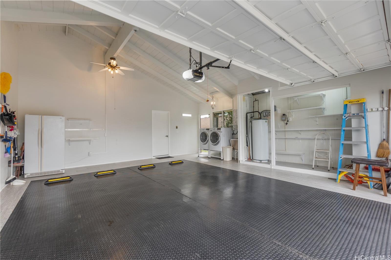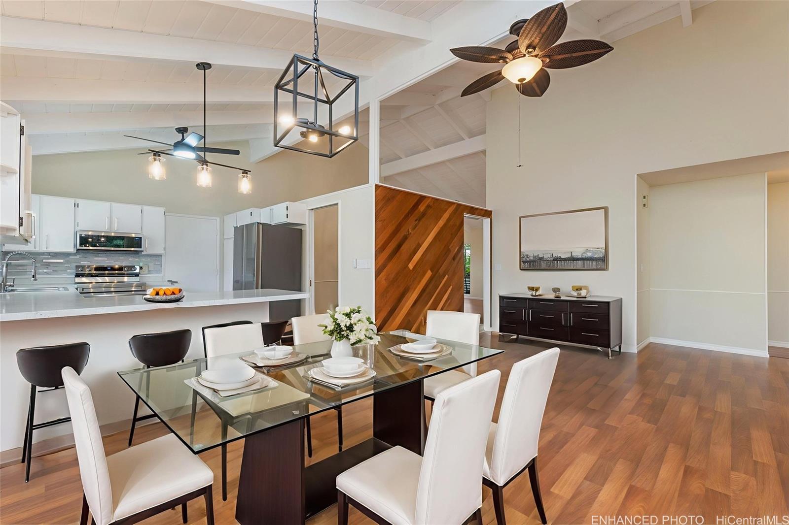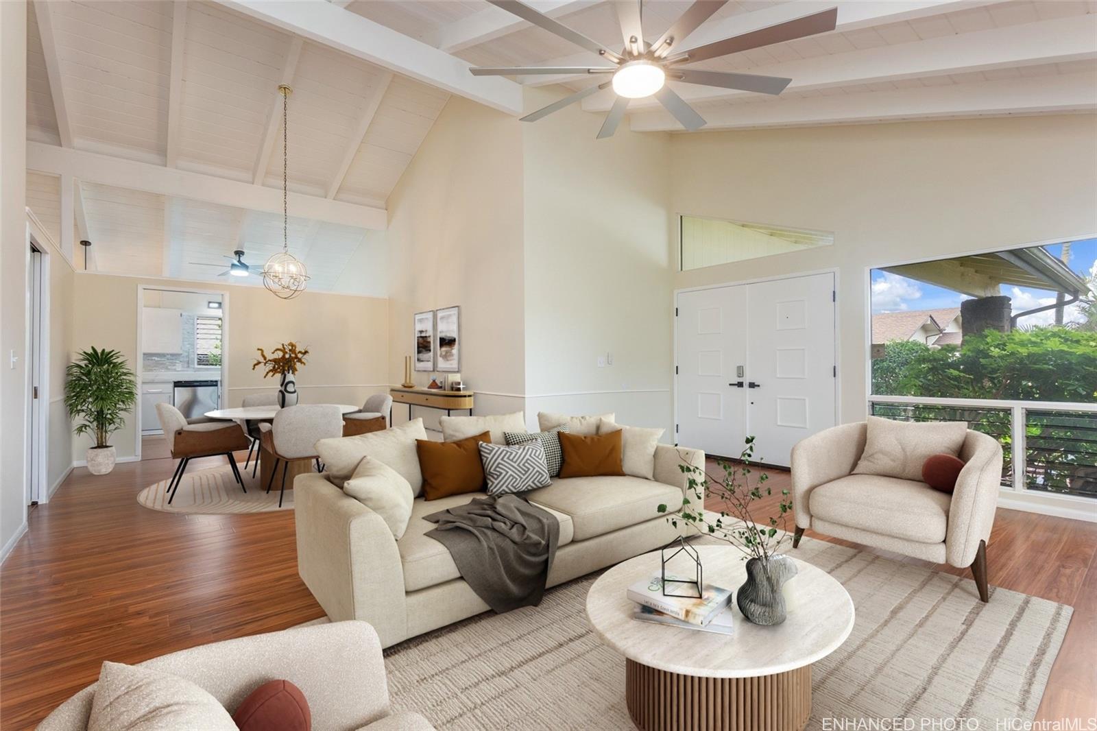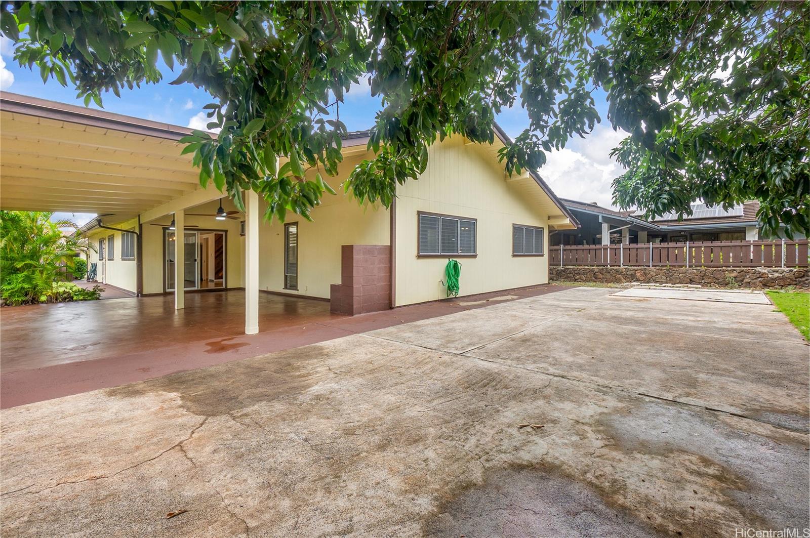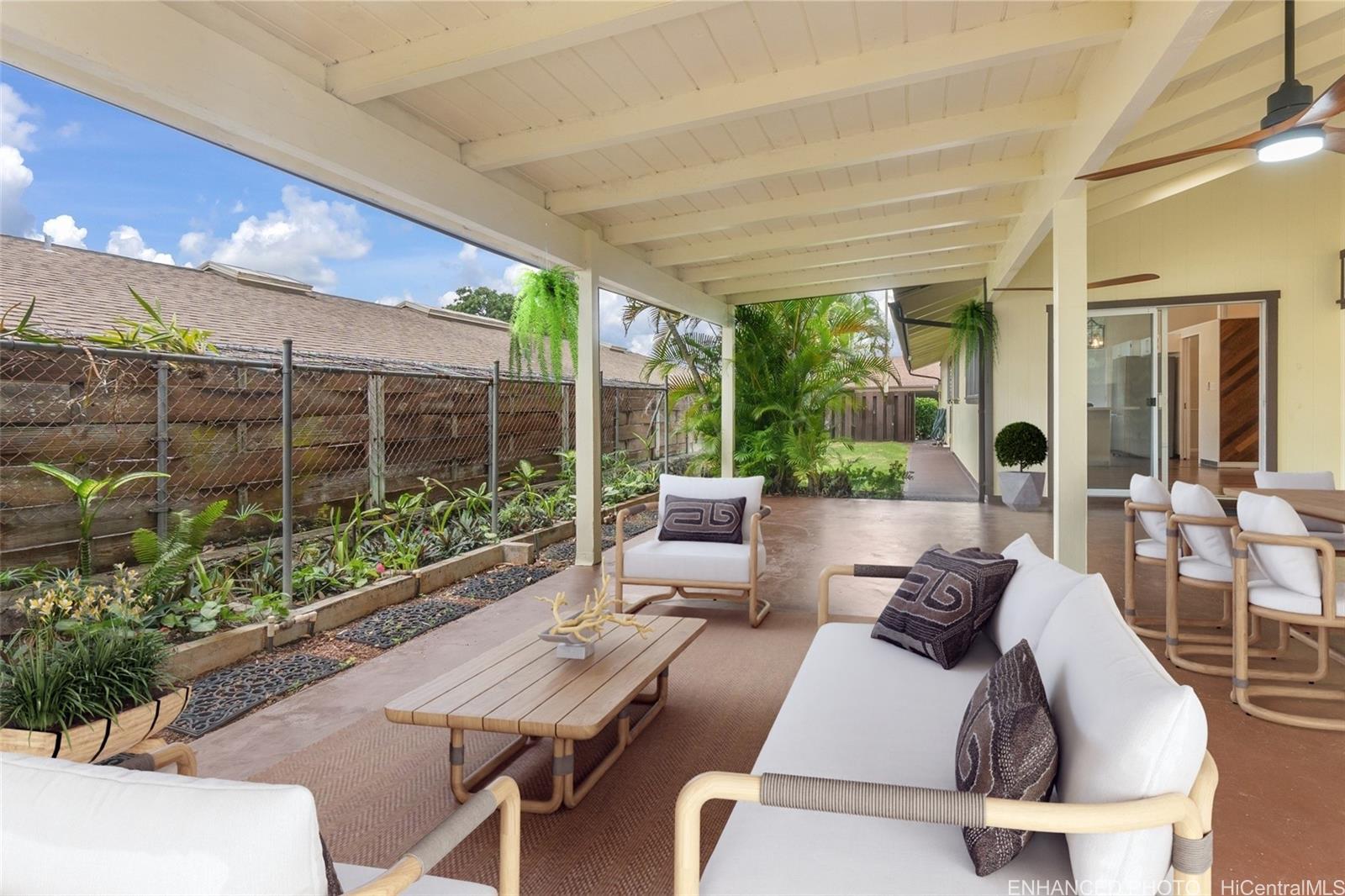 Outside, enjoy the privacy you rarely find: mostly flat, fully fenced backyard framed by trees and lush greenery. Entertain under the covered lanai and spread out on the expansive patio, new lighting w/ceiling fans—perfect for BBQs, pets, relaxed Hawai?i living. Oversized luxury 2-car garage with fabulous laundry, storage, and workspaces. Large driveway w/extra parking. Community Center membership included as part of the HOA is $55/month includes pool, jacuzzi, pickleball/tennis/basketball courts, + rentable gathering space. Easy access to Pearl Harbor, Pearlridge, transit, and planned new stadium. See it in person—this one is special! One or more photos have been enhanced.