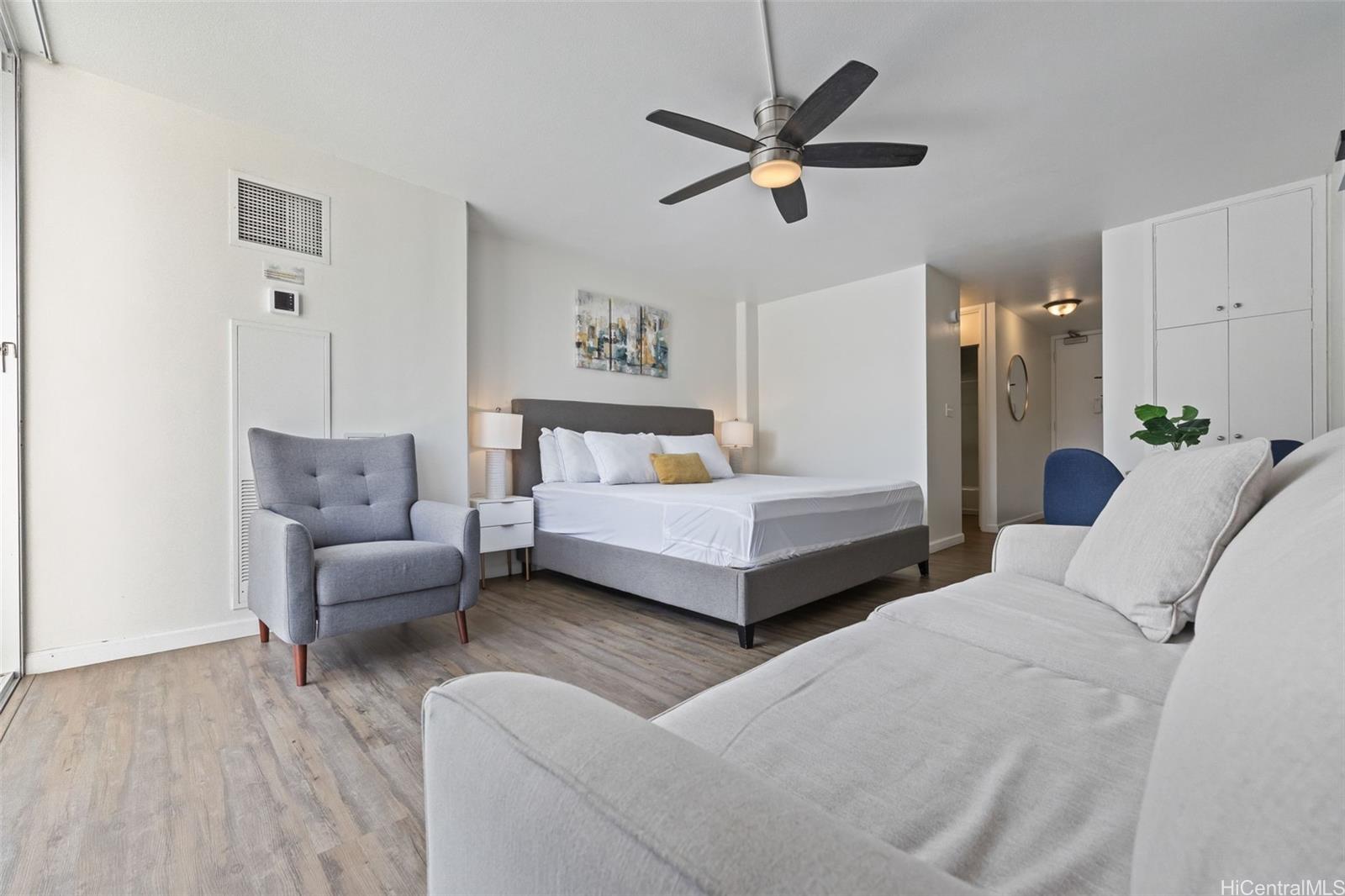 象徴的なイリカイマリーナで、スタイルと投資の可能性が完璧に融合した物件をご体験ください。この素晴らしいスタジオは、ゲストエクスペリエンスを最大限に高めるために特別に設計された、新しく改装されたターンキー仕上げと家具で完全に再考されました。切望されるリゾートゾーンに位置するこの物件は、合法的な短期レンタルが可能で、経験豊富な投資家や、ホノルルでスタイリッシュなピエ・ア・テールを求める人にとって価値の高い機会となります。思慮深く再設計されたこのスタジオには、カスタムキャビネットを備えた設備の整ったキッチン、専用のダイニングエリア、そして現代の旅行者のための独立した勉強机が備わっています。豪華なキングサイズベッドと快適なソファベッドを含む多目的な寝室レイアウトは、最大限の収容能力と快適さを保証します。大きな窓からは美しい山の景色が眺められ、活気に満ちたワイキキのライフスタイルに静かな背景を提供します。便利な立地で、世界クラスのアラモアナセンター、ヨットハーバー、ボートパークまで徒歩圏内です。敷地内に有料駐車場があり、ユニットはすぐにAirbnbで利用できるように設備が整っています。手頃な価格で信じられないほどの価値を提供する、これがワイキキでの最高の暮らしです!