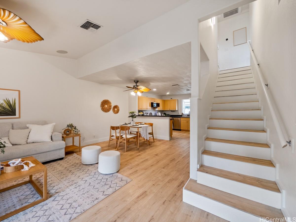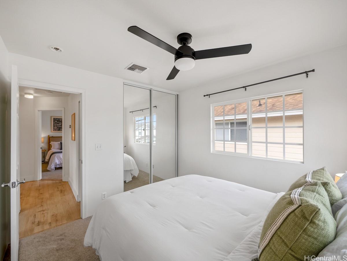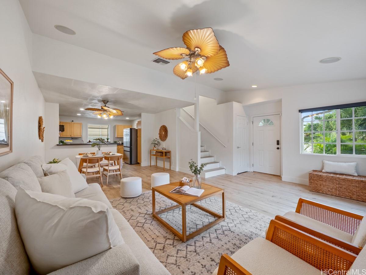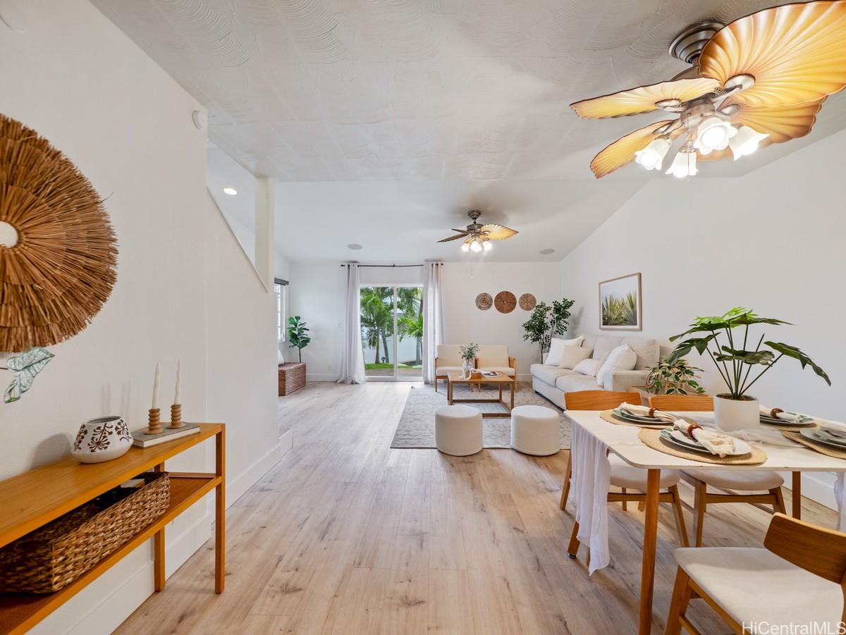 シーカントリーへようこそ。明るく、すぐに入居可能な3ベッドルーム、2バスルームの一戸建て住宅は、快適さ、効率性、利便性を完璧に融合させた物件です。静かな袋小路に佇む、塗り替え済みの2階建て住宅は、リフォーム済みのフローリング、新しいステンレス製の家電、モダンなキッチンとバスルームを備えています。広々としたオープンコンセプトのリビングエリアからは、緑豊かな造園とスプリンクラーシステムを備えた、手入れの手間がかからないプライベートな庭へと続きます。ベランダからは山と夕日の絶景をお楽しみいただけます。さらに、22枚のリースソーラーパネルと2つのテスラバッテリーが電気代を節約し、安心の暮らしを実現します。2台分のガレージは十分な収納スペースを提供し、マイリビーチパーク、近隣のハイキングコース、シーカントリーのショップやコミュニティパークまでわずか数分です。低料金のHOA(住宅所有者管理組合)費、ペットフレンドリーな地域、そして強いコミュニティ意識を備えたこの住宅は、西オアフの暮らしの醍醐味を体現しています。