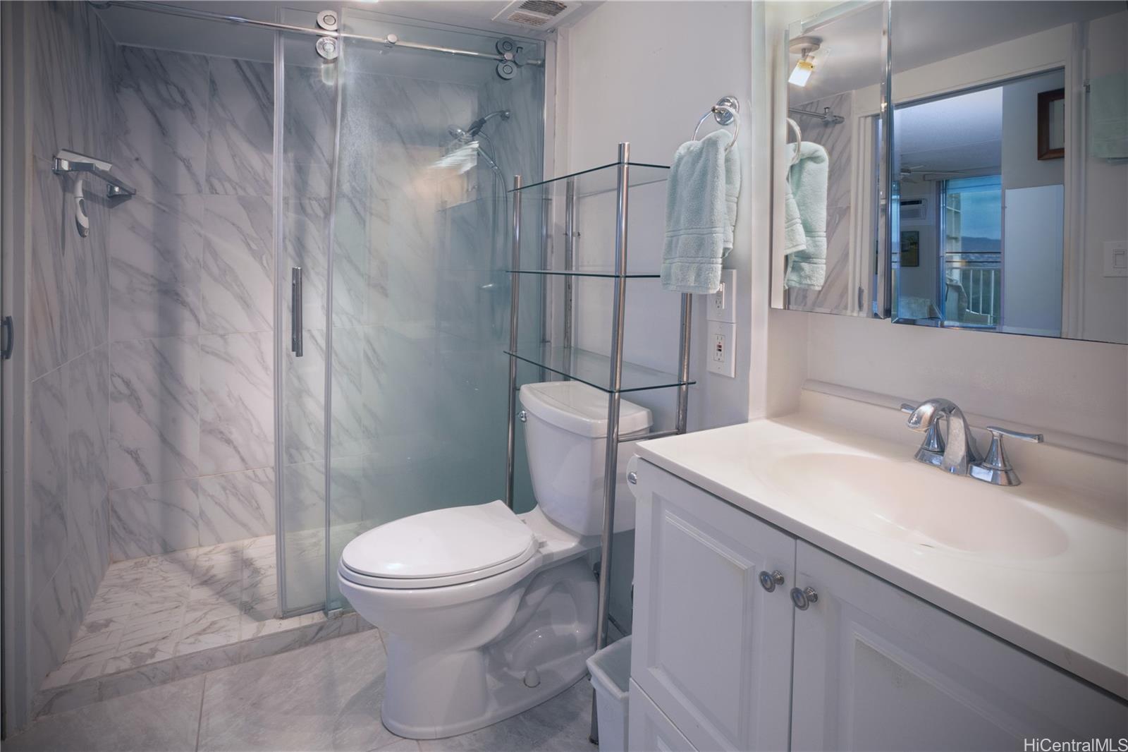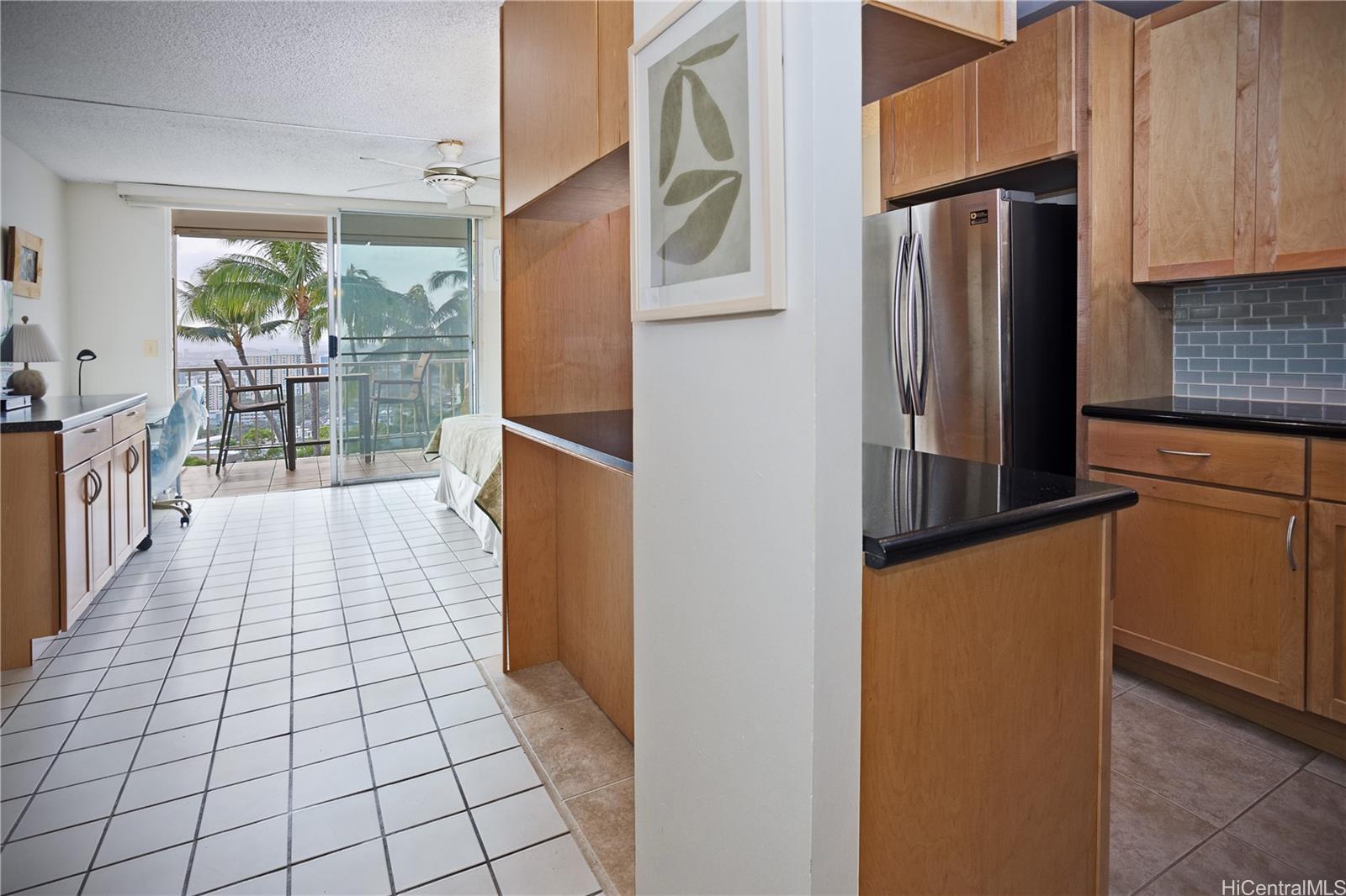 Waianae Mountains. The unit features an open layout with a remodeled kitchen. Granite counters and wooden cabinets throughout. Full bathroom and walk-in closet add to the appeal. Enjoy your own private lanai with storage while taking in the sweeping views of the Honolulu city lights. The building includes a pool for residents and is located just minutes from shopping, dining, and entertainment. Walking distance to Queens Medical Center