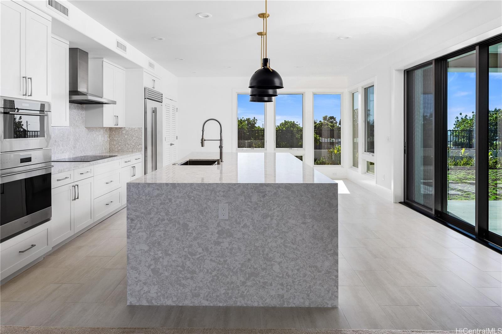 Enjoy panoramic ocean views and upscale features including central AC, a 120 gallon solar water heater, and accommodations for a PV solar electric system and EV charger. The gourmet kitchen is equipped with Sub Zero and Wolf appliances, a 42” built in refrigerator, 36" frameless induction cooktop, built in convection oven, drop down microwave oven, and a Bosch Energy Star dishwasher.