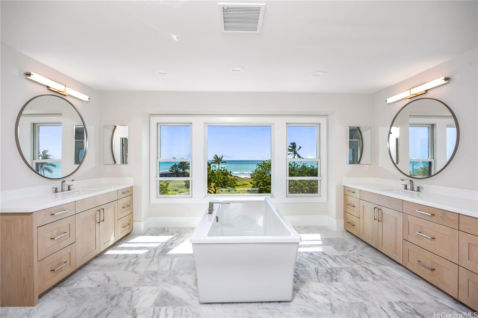 Step into coastal luxury with this expansive new construction residence, offering over 4,000 square feet of beautifully designed living space. With five bedrooms, four-and-a-half baths, a dedicated study, a covered lanai, and a private courtyard, this home seamlessly blends functionality with sophistication—perfect for both peaceful retreat and vibrant entertaining. Enjoy sweeping ocean views and a full suite of elevated features, central air conditioning, solar water heater, accommodations for a photovoltaic solar electric system and EV charger. The gourmet kitchen is thoughtfully appointed with top-tier appliances: a 42” built-in Sub-Zero refrigerator, Wolf induction cooktop, convection oven, microwave with drop-down door, and an Energy Star-certified Bosch dishwasher—all designed for culinary excellence. Professionally landscaped yards with automatic irrigation offer low-maintenance spaces to relax and enjoy the breeze. Lot 96 - 75.20 AR floorplan Kekainani at Hoakalei | One of the final 32 luxury residences in the prestigious Kuapapa neighborhood.