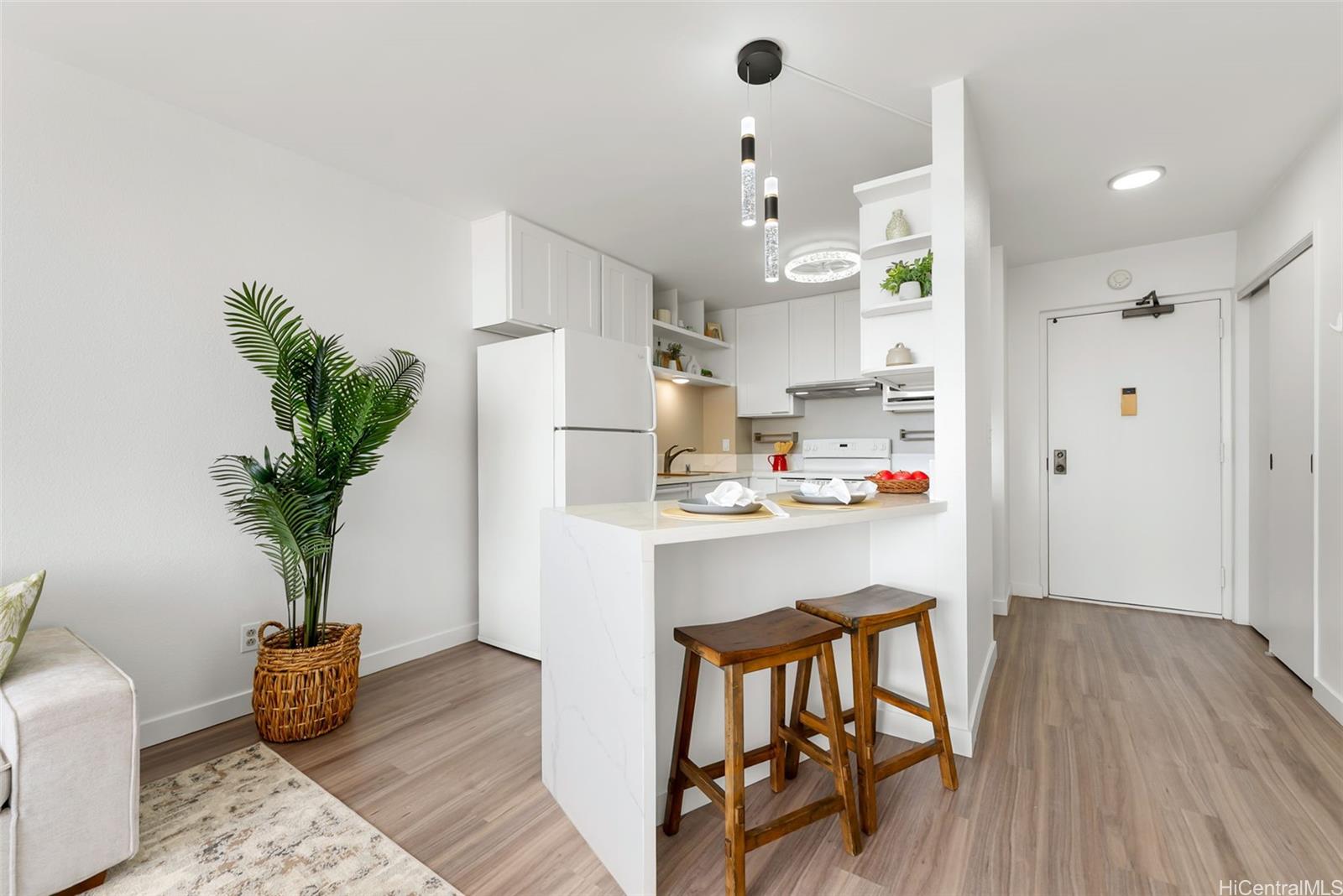ホノルル・ダウンタウンの中心部で、快適さと利便性が融合した都会の暮らしを満喫しませんか? ククイ・プラザのダイヤモンドヘッドタワーという理想的なロケーションにある、センス良くアップグレードされた1ベッドルーム/1バスルームのコンドミニアムは必見です。美しい山々と街の景色を望むこのユニットは、モダンなビニールプランクフローリング、リフレッシュされたバスルーム、ポップコーン天井の撤去、そしてクォーツカウンターと洗練された滝のようなエッジを備えた、美しく改装されたオープンキッチンを備えています。開放的な間取りは自然光をたっぷりと取り込み、温かく居心地の良い空間を演出しています。屋根付き専用駐車場1台分付き。ククイ・プラザは、緑豊かなガーデンコートヤード、静かな池、スイミングプール、バーベキューエリア、24時間体制のセキュリティなど、リゾートスタイルのアメニティを提供しています。ショッピング、ダイニング、エンターテイメントもすぐそば。便利なホノルル・ダウンタウン・ライフスタイルをお楽しみください!