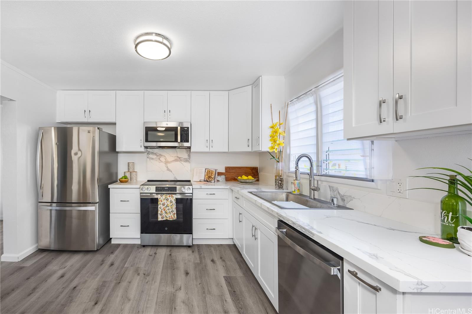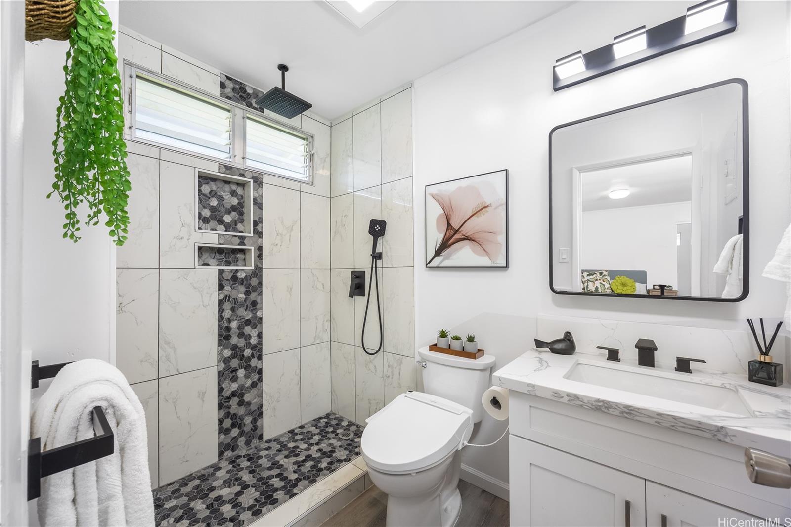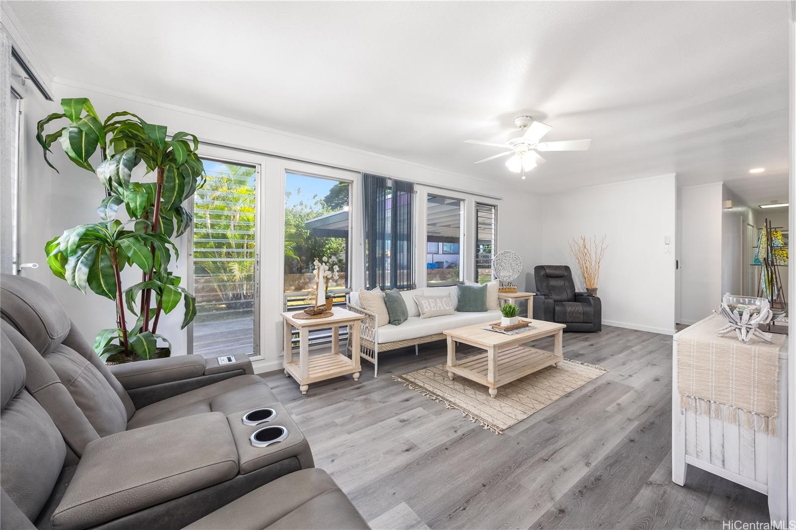 Rarely available 5-bedroom, 2-bath home centrally located in desirable Pearl City with quick and easy access to H-1, H-2 and H-3. This beautiful home radiates island charm. Completely renovated from top to bottom showcasing modern design, style and comfort. Step inside to a bright living experience beaming with natural light, brand-new interior and exterior paint and stylish luxury flooring. Featuring a fully upgraded kitchen with sleek countertops, custom cabinets and brand-new dishwasher, microwave hood and range oven. Both bathrooms have been transformed into spa-like retreats with premium features including rainfall shower heads and elegantly designed tiled showers. Stay cool with split AC units throughout. Drastically lower utility bills with 17-OWNED PV panels (NEM) and a solar water heater system. Enjoy relaxing or entertaining in the large covered patio, carport and outdoor areas. Great community in a prime location near shopping, dining, parks and recreation center. A true must-see!