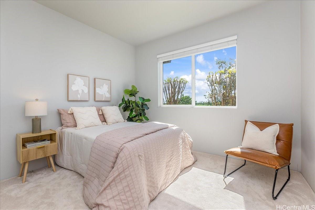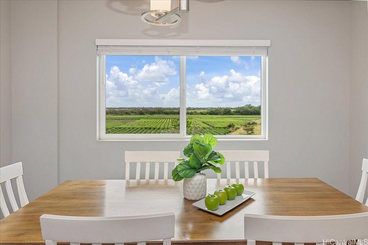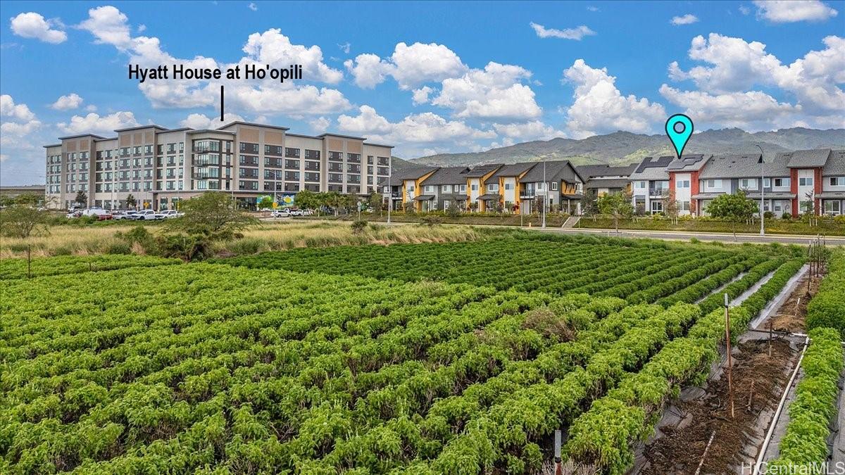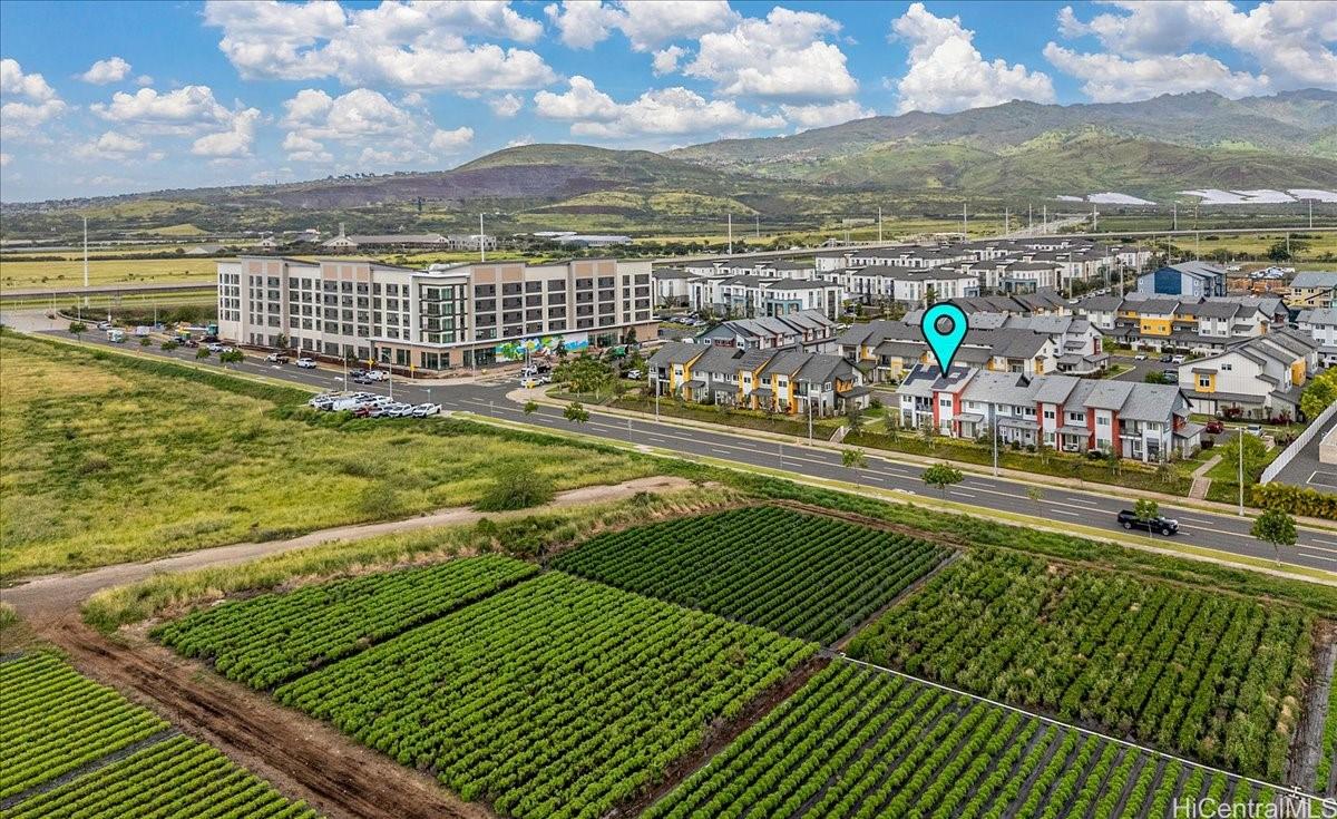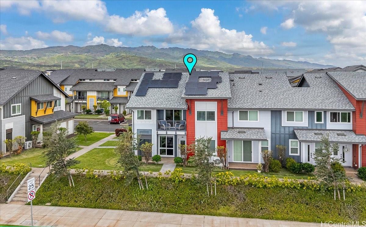 Experience versatile living in this desirable FLEX TOWNHOME, featuring stunning views of green farmlands reminiscent of wine country. This unique property is zoned for MIXED USE (live/work), the ground-level flex space w/ high ceilings offers endless possibilities for multi-generational living, guest suite, or a home-based business. The first floor includes a full ADA-compliant bath, while the upper level boasts a spacious 2-bdrm, 2-bath layout w/ a private covered lanai showcasing one of the best vistas in the Hoopili community. With over 1,700 sqft., this unit includes a 3-car garage, 3-tandem spots, and 1-assigned stall. It features 18 OWNED SOLAR PV PANELS w/ battery storage, split AC system, luxury vinyl plank flooring, and electric vehicle pre-wiring. This rare gem is one of only 21 designated flex units among 88 total, w/ just 2 resold since built at prices of $949k & $1m. Conveniently located near the upcoming Hyatt hotel, Festival Street, and parks, including dog, soccer, and pickleball courts, it's minutes from H-1, rail station, and Ka Makana Ali’i Mall. Enjoy resort-style amenities in one of Ewa Beach's most sought-after communities! There are 2 enhanced photos.