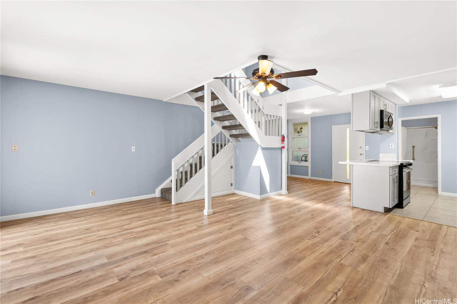 Come and see this spacious unit! Offering a functional floor plan that includes a first-floor bedroom and full bathroom, providing flexible living options. A bonus loft area adds additional usable space that can serve as a home office, study area, or extra living area. The home was renovated in 2025, with updates that include new flooring, interior painting, and ceiling fans. The property comes with two parking stalls, consisting of one covered carport and one open stall. The corner location allows for added privacy and natural light. Laulea Town Houses is located within the Mililani community with convenient access to nearby shopping centers, parks, recreation areas, dining options, and major roadways, supporting everyday errands and commuting needs.