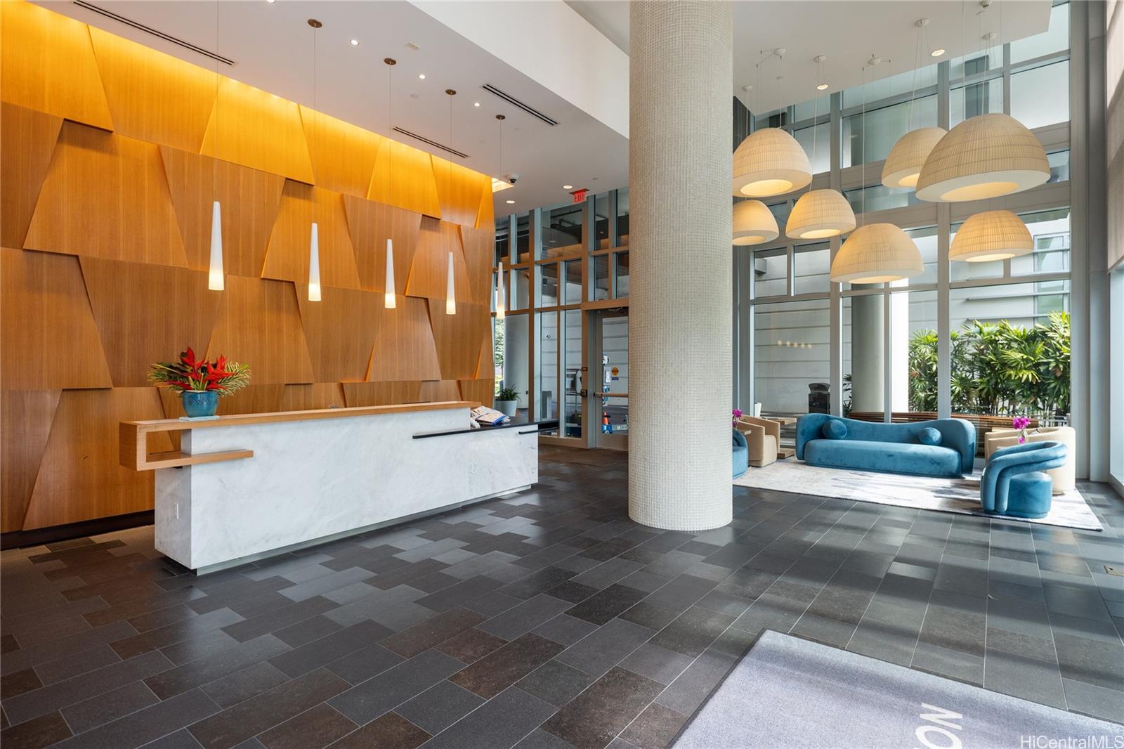 カカアコのザ・コレクションにある、希少な東向き角部屋09号室。丁寧にメンテナンスされたユニット1509は、東向きのため山から海まで美しい眺望が楽しめます。広々とした2ベッドルームの間取りは、ウォークインクローゼット付きのゆったりとした主寝室、特注のマンゴーウッドのアクセントウォール、ボッシュ製のステンレス製家電、クォーツ製のカウンタートップ、設置済みのローラーシェード、そして77平方フィートの屋根付きラナイを備えた、独立したベッドルームレイアウトが特徴です。並列の屋根付き駐車場2台分と収納ロッカーも付いています。建物のアメニティには、プール、ジャグジー、カバナ、バーベキューエリア、フィットネスセンター、ヨガルーム、パーティールームなどがあります。