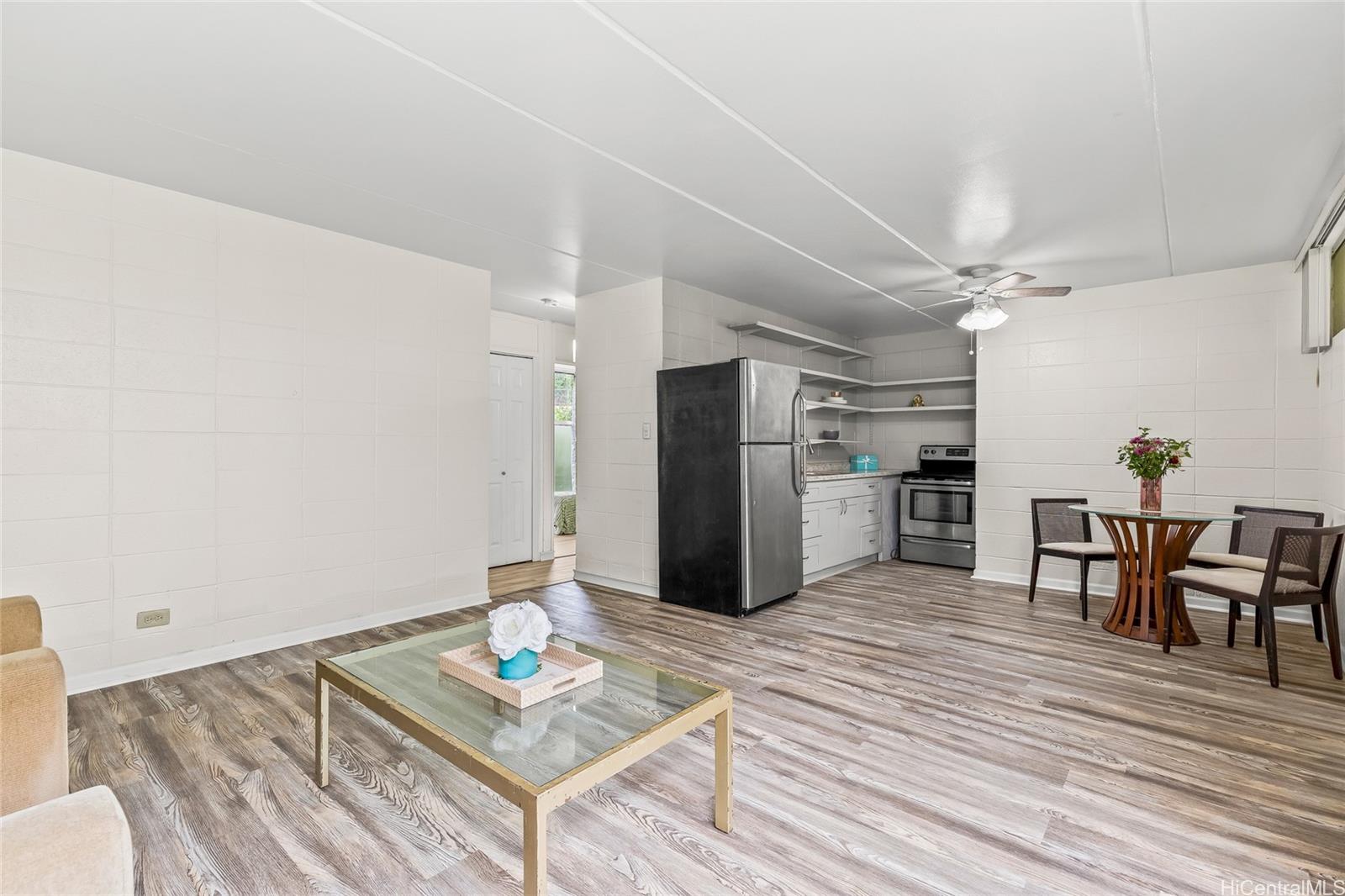 This spacious ground floor unit at Waipio Gardens features an open floor plan, a community garden in front and back of the unit, an upgraded kitchen, and a renovated bathroom with a new shower and vanity. Smooth ceiling! This condo also includes vinyl flooring and a front-load washer and dryer.