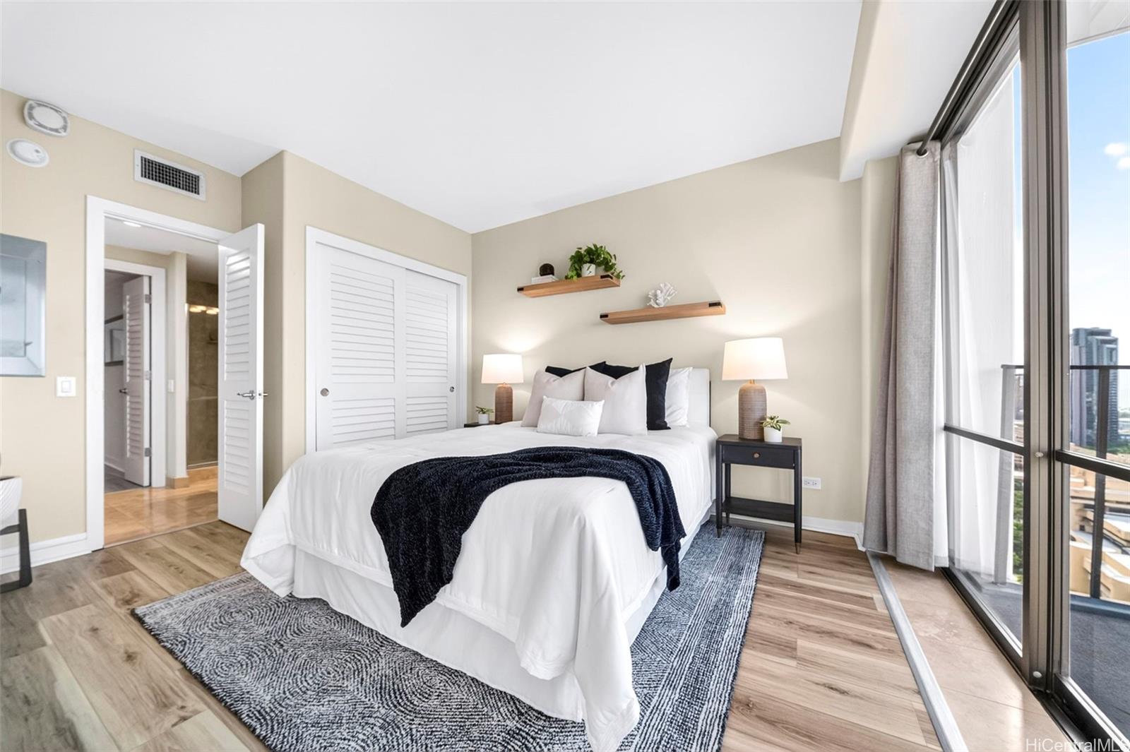 Sunset Open House Saturday 3/28/26 from 5pm-7pm! Breathtaking, unobstructed wide-angled views of the harbor and sparkling ocean from the spacious living room and two bedrooms! Wake up and wind down to panoramic ocean vistas that truly define island living. This well-maintained residence features vinyl flooring throughout and travertine tile in the bathroom for a clean and timeless finish. The living room is enhanced by showcase wall lighting and a recessed ceiling, creating a warm and elegant ambiance. The kitchen includes granite countertops, stainless steel appliances, and a wine chiller. Central air conditioning provides year-round comfort. The maintenance fee includes electricity, cable, internet, water, sewer, and refuse, offering exceptional value and convenience. One covered parking stall included. Harbor Square offers a sixth-floor recreation deck with pool and BBQ area. Located near restaurants, shops, businesses, and Downtown Honolulu.