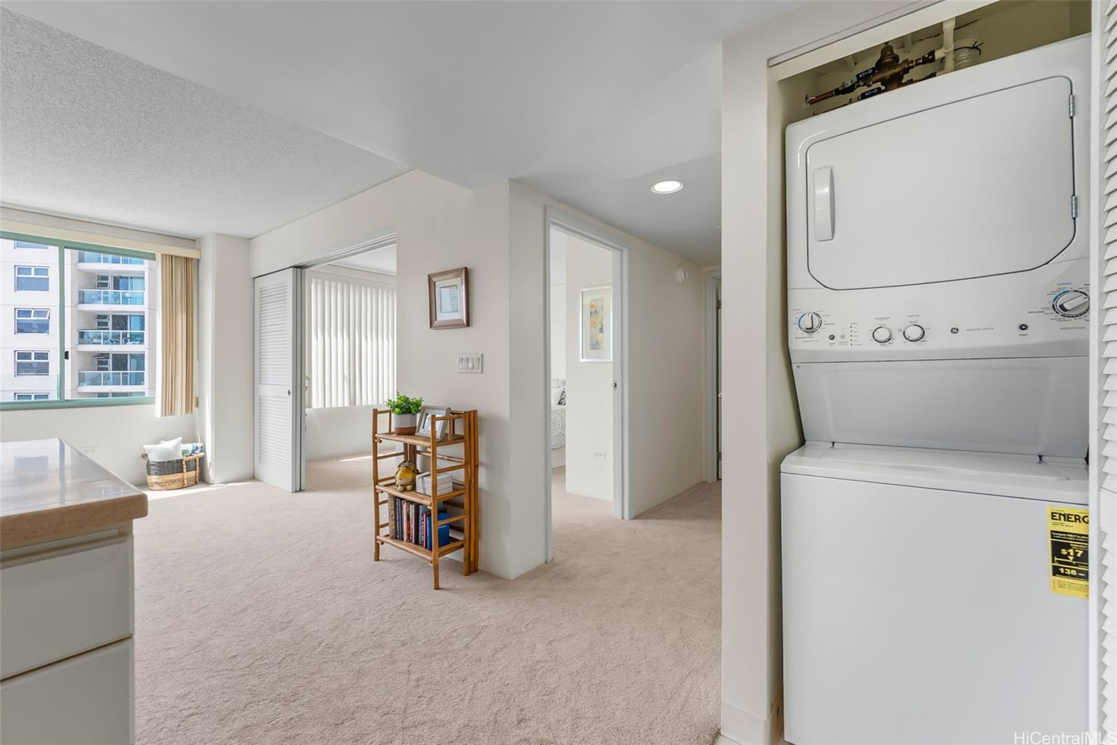 Enjoy the comfort and convenience at One Kalakaua Senior Living. 2-bedroom, 1-bath condo with a wide full-sized parking stall. New carpet and padding installed prior to listing along with freshly painted walls. Featuring an open floor plan with a flexible layout that can be used as a 2/1 or a 1/1 with a large den. Large windows provide plenty of natural light, offering, city, tree top, and green park views. Conveniently located with easy access to so many shopping options, restaurants, public transportation, hospitals, parks, etc. OKSL is a secured building with secured covered parking. Building amenities include a swimming pool, jacuzzi, landscaped outdoor walking paths, library, dining room, hair salon, exercise room, and rec room. Fees / Club Dues include some of the following services - Utilities (central AC, basic cable tv, water, and electricity), security, 1 meal credit / day, weekly housekeeping, wellness, exercise, and social activities.