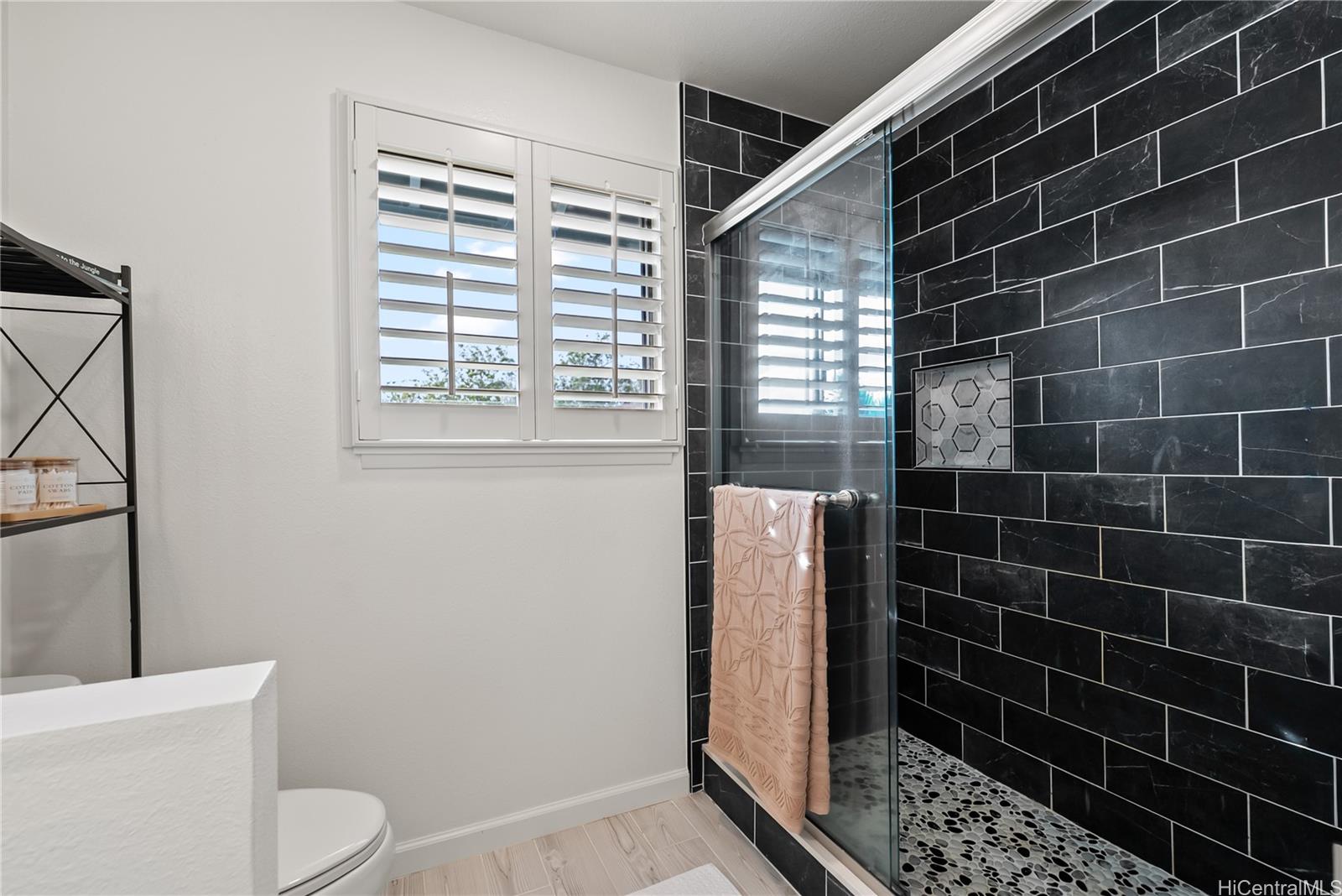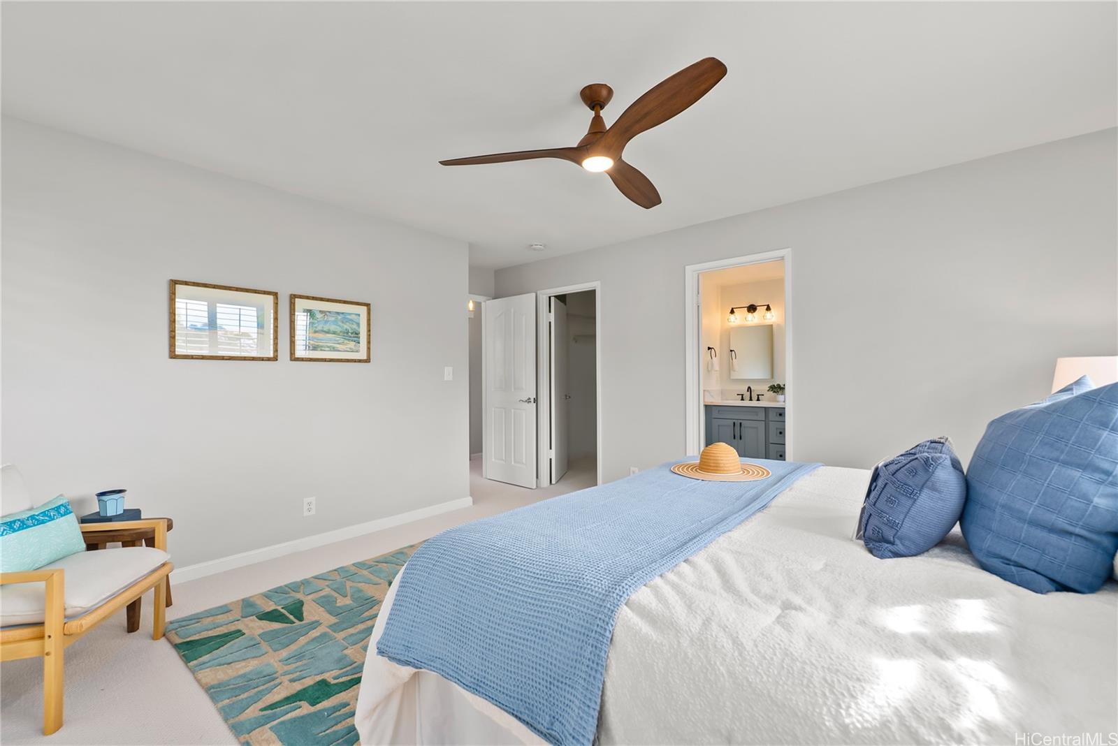 Experience an island oasis atop Mililani Mauka in the sought-after Kapanoe area. This beautifully updated 4-bedroom,3-bath home blends modern elegance with a resort lifestyle. The light-filled living room features vaulted ceilings & an open-concept design showcases a stunningly renovated chef’s kitchen, complete with soft-close shaker cabinetry, quartz countertops & professional-grade GE Café Collection appliances. The coveted Reflections Model D floorplan offers a ground-floor bedroom & full bath, ideal for a guest room. Upstairs you'll find the primary suite,2 bedrooms & a spacious loft, perfect for a home office. Features incl. 8 split A/Cs, plantation shutters, luxury vinyl flooring, new carpet & fresh paint. Enjoy private indoor-outdoor living with a heated saltwater pool w customizable LED lighting, a cozy firepit & covered lanai for dining & relaxing.Keep active in the custom garage fitness area; complete w workout equipment,2-person infrared sauna, new split A/C & recessed lighting.Energy-efficient w 24 owned PV panels on Net Metering, Solar Heater, a 5-yr roof & freshly painted exterior. Enjoy access to 7 recreation centers & top-rated schools in this amazing neighborhood.