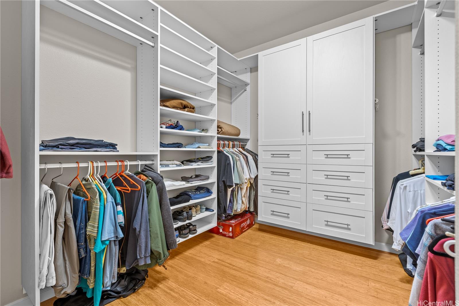 mahogany cabinetry unfolds with intention and elegance. Designed for entertaining, the open layout flows through the main living area and sweeping covered lanai with entrances to the kitchen, living room and primary bedroom. Warm Cali bamboo flooring throughout and tile with epoxy grout in the bathrooms and kitchen ensures beauty with effortless maintenance. This home blends luxury and innovation which includes a photovoltaic system with a Tesla Powerwall, solar hot water, whole-house water filtration, split A/C system, central vacuum and a spacious laundry room. The primary suite, a private retreat, features a custom designed walk in closet, a spa-like bathroom with a walk-in curb less visually serene shower and a discreet smart toilet/bidet with a privacy door. The oversized garage adds generous storage and work space. Minutes from world class beaches, golf, shopping and dining.