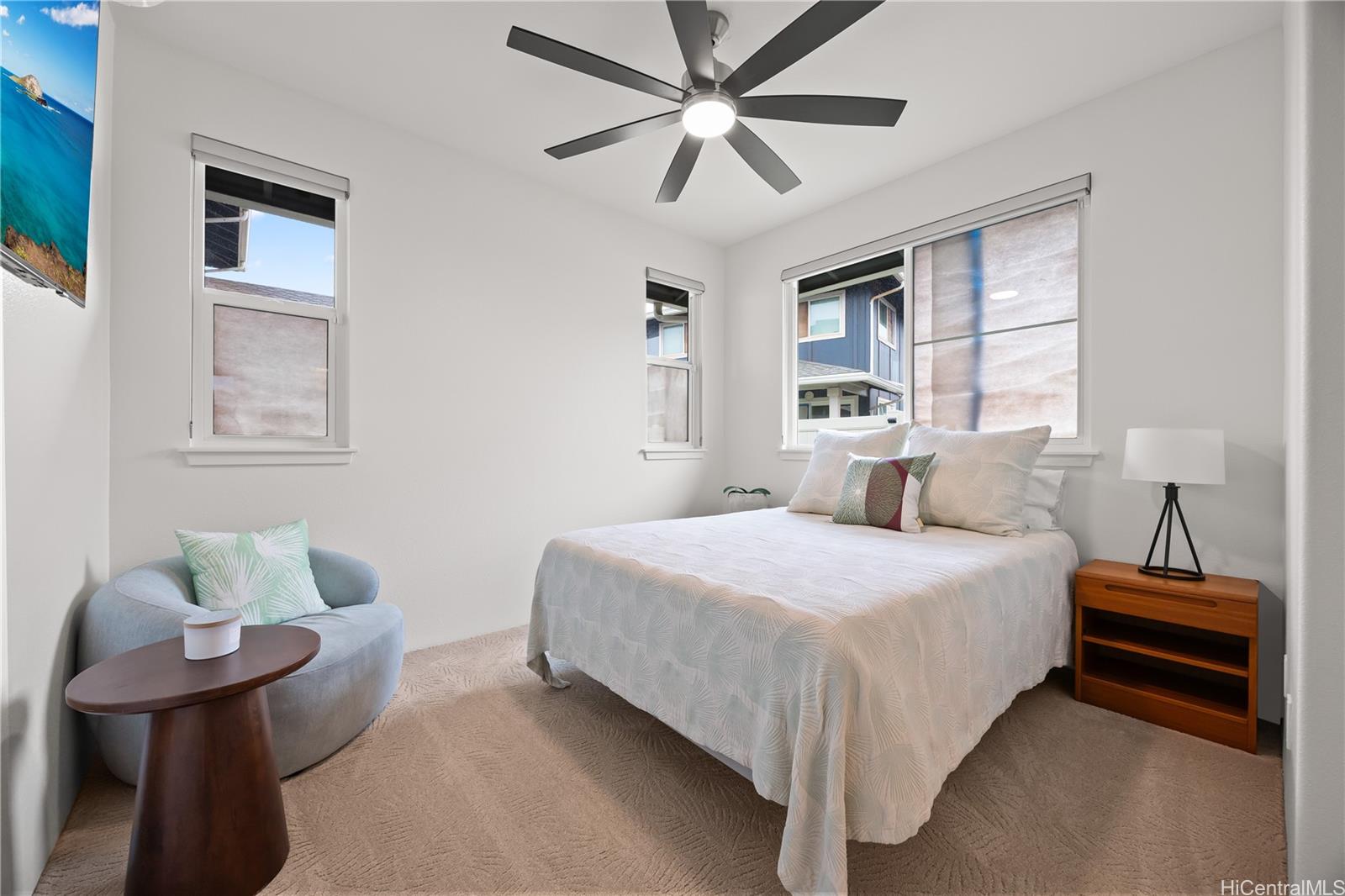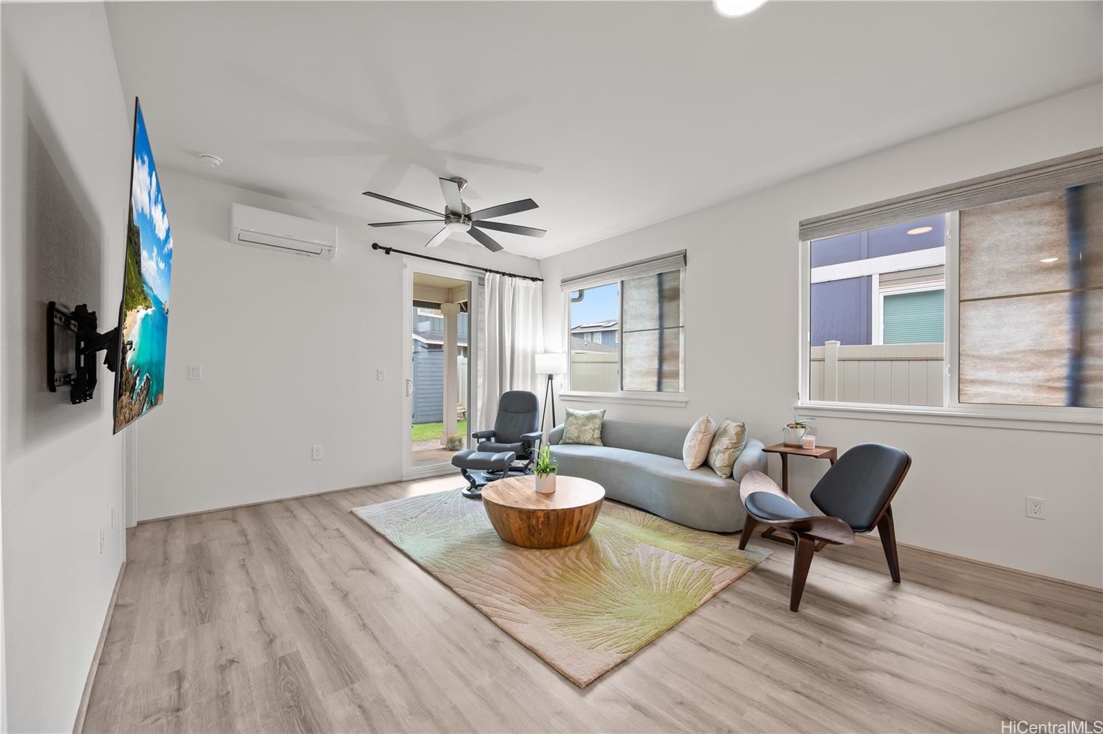 Come and discover Waioha II at Koa Ridge! Welcome to modern island living in the beautiful designed single level home with 3 bedroom, 2 baths. This home offers a bright open-concept floor plan with stylish finishes and loads of up grades. The contemporary kitchen features sleek cabinetry, upgraded Fisher & Paykel appliances, a spacious island perfect for entertaining or casual dining. The living and dining areas flow seamlessly together, creating a comfortable space for gathering and everyday living. The primary suite offers a peaceful retreat with ample closet space and walk- in closet. Enjoy indoor-outdoor living with a two-car garage, all within a welcoming neighborhood setting. Built with modern comfort and efficiency in mind, this home offers the perfect blend of style, function, and low-maintenance living.An added bonus is energy- efficient upgrades include solar hot-water system and 20 Panels for Photovoltaic with 2 Tesla Batteries. Conveniently located near Waipio Costco, shopping centers, parks, schools and with easy freeway access. Don't miss the opportunity to own a move-in-ready home in one of the areas newest communities.Water and sewer are sub-metered with association