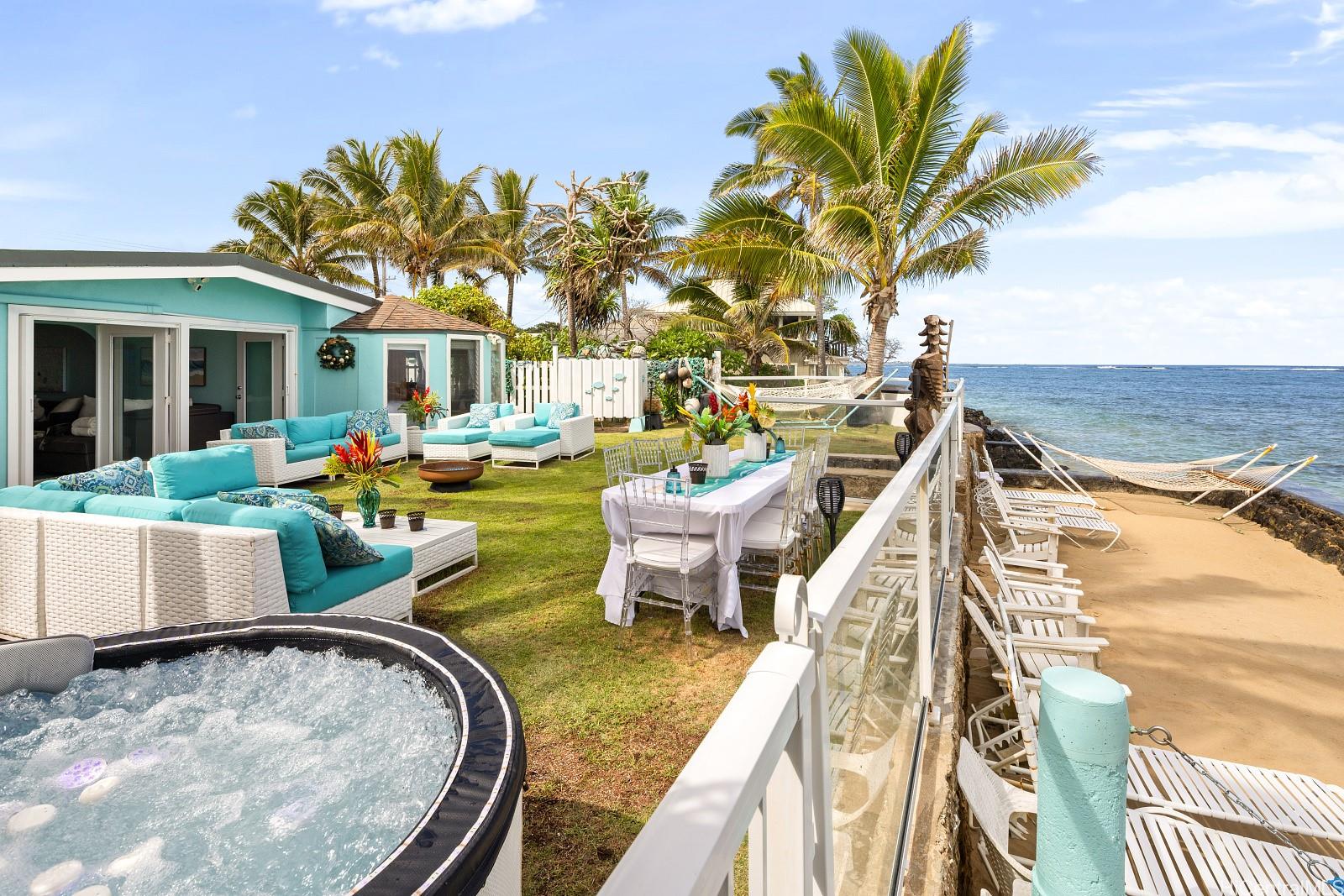 この素晴らしい3ベッドルーム、3バスルームの一戸建て住宅で、究極のオーシャンフロントライフをご体験ください。海岸線沿いの絶好のロケーションに位置するこの家は、既存の防波堤により、ハワイでは他に類を見ないプライベートビーチオアシスを実現し、プライバシーを確保しています。室内に入ると、高級感あふれる仕上げ、モダンな床材、デザイナーズタッチが随所に施された、最新のインテリアが目に飛び込んできます。グルメキッチンには高級家電が完備され、ゲストをもてなしたり、静かな海辺の朝を楽しんだりするのに最適です。屋外では、波打ち際のビーチフロントジャグジーでリラックスしたり、リゾートにも引けを取らない、リラクゼーションと素晴らしい日の出の景色を楽しめる屋外スペースでゲストをもてなしたりできます。自家所有のソーラーパネルとトロピカルな造園により、快適さ、持続可能性、そして贅沢さが美しく調和しています。現在、収益性の高い月額賃貸物件として運営されているこの特別な家(購入者は確認が必要)は、プライベートで平和で忘れられない、アイランドライフの本質を体現しています。