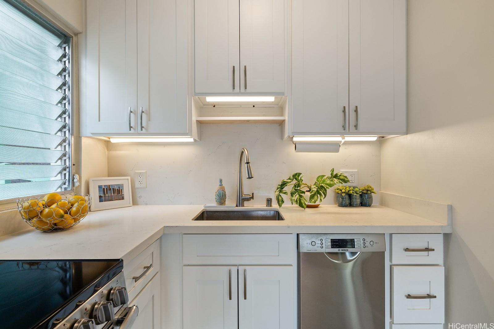 Wake up to Diamond Head views from your bed and catch gorgeous ocean glimpses from the spacious wrap-around lanai. This breezy, light-filled, private end unit 1BR features expansive, approximately 9 ft ceilings (found on 5th floor only), a beautifully updated kitchen and bath with high-end appliances and quartz countertops, built-in foyer storage, and an integrated kitchen water filtration system. Large onsite storage unit included; bike and surfboard storage available.