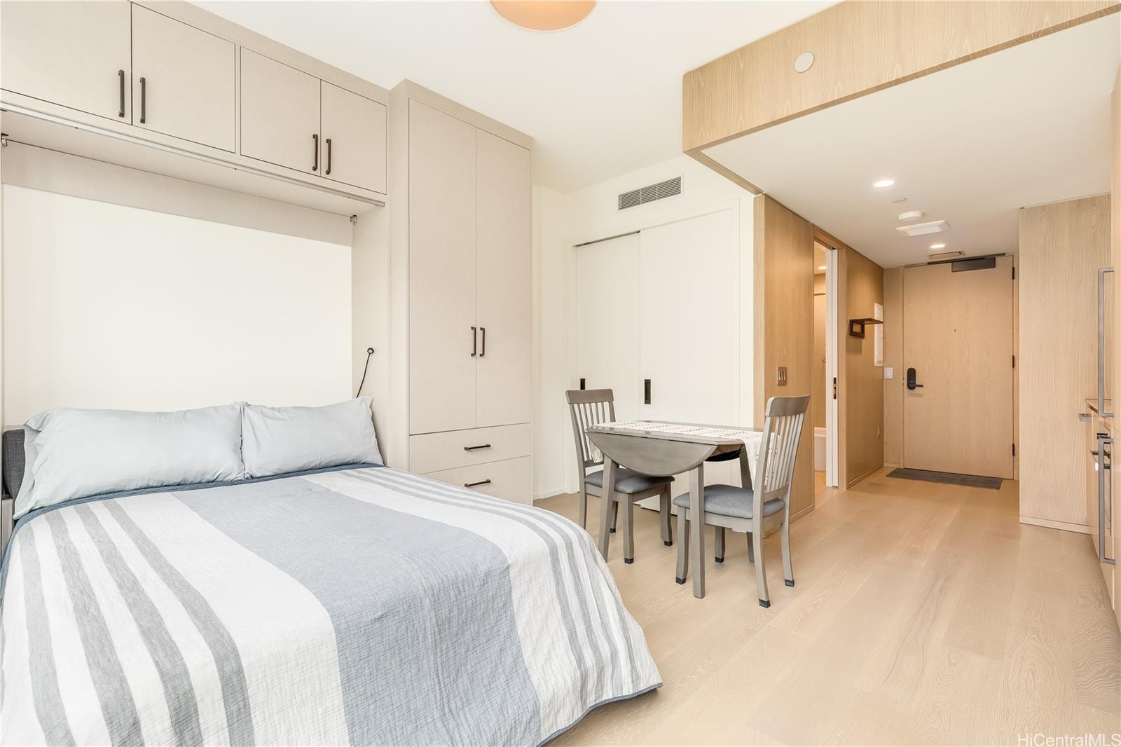 Welcome home to Koula at Ward Village, where modern living meets everyday convenience. This studio residence offers the best-priced opportunity in Koula, delivering remarkable value in the heart of Kakaako. Situated in the podium tower, it includes 1 parking stall conveniently located on the same floor as the unit for easy, direct access. Thoughtfully designed to maximize space, the unit showcases added features including a California Closets Murphy bed with built-in storage, an additional custom pantry unit, and dual-layer window drapery that provides natural light by day and enhanced privacy in the evening. Enjoy the comfort of central AC, the flexibility of a pet-friendly building (please verify), and an abundance of resort-style amenities designed to enhance your lifestyle. Ideally situated in this vibrant, highly sought-after neighborhood, this exceptional home is just steps from Victoria Ward Park, Whole Foods, Ala Moana Beach, acclaimed dining, boutique shopping, parks, and much more offering a dynamic yet comfortable experience right outside your door. Call your agent to schedule a private showing today!