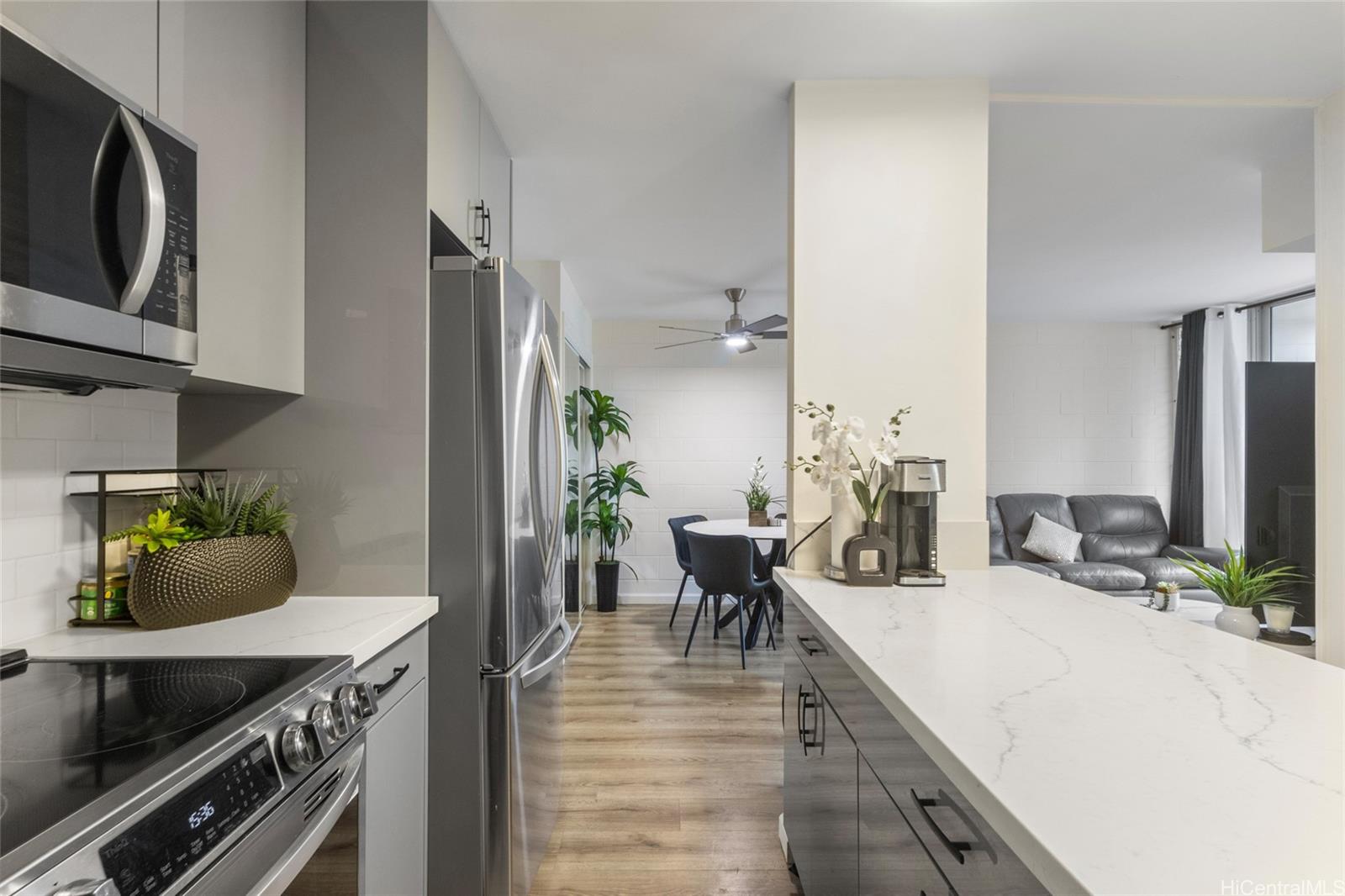 The home features a remodeled kitchen, vinyl plank flooring, fresh interior paint, and popcorn ceiling removal. Enjoy city views from the preferred mauka side. This unit is not facing the freeway, offering a quieter side of the building. Functional layout includes a lanai and in-unit washer/dryer.