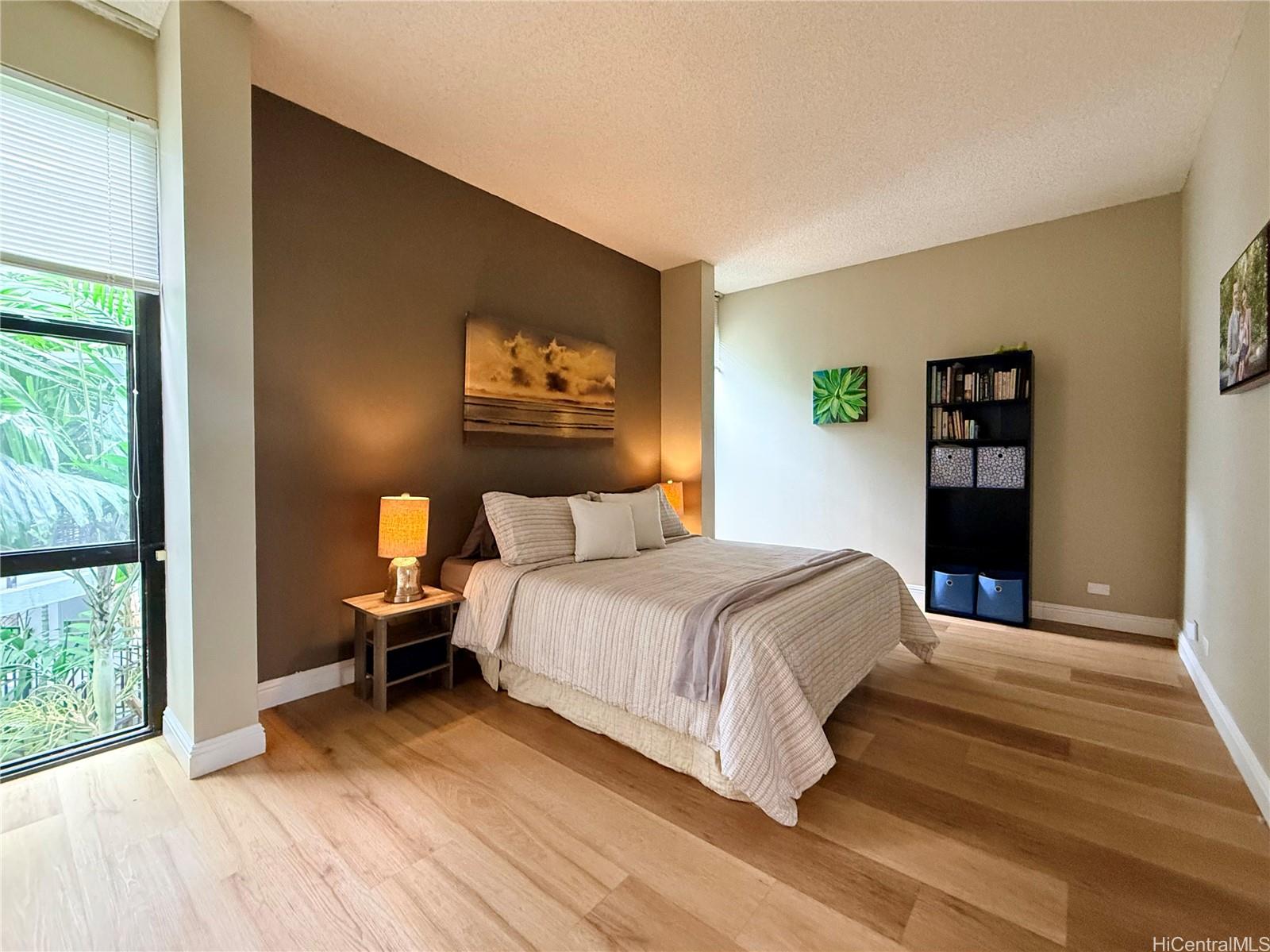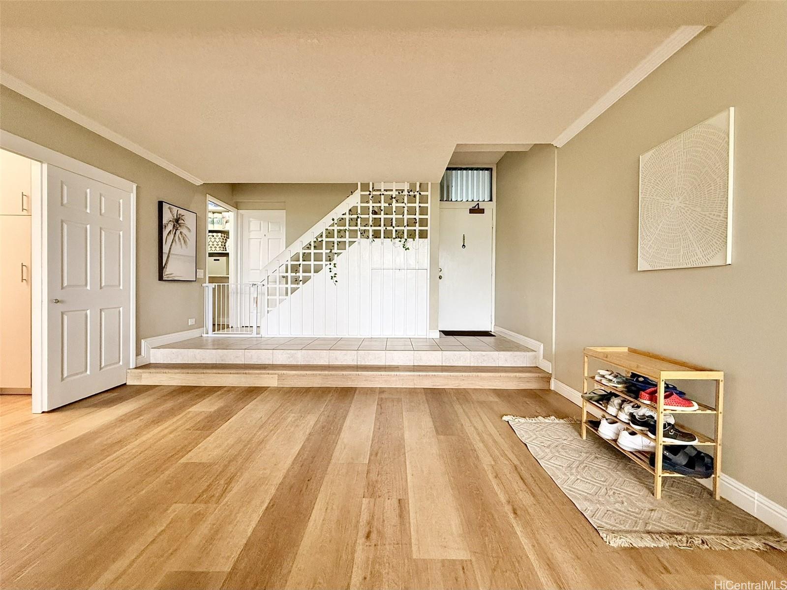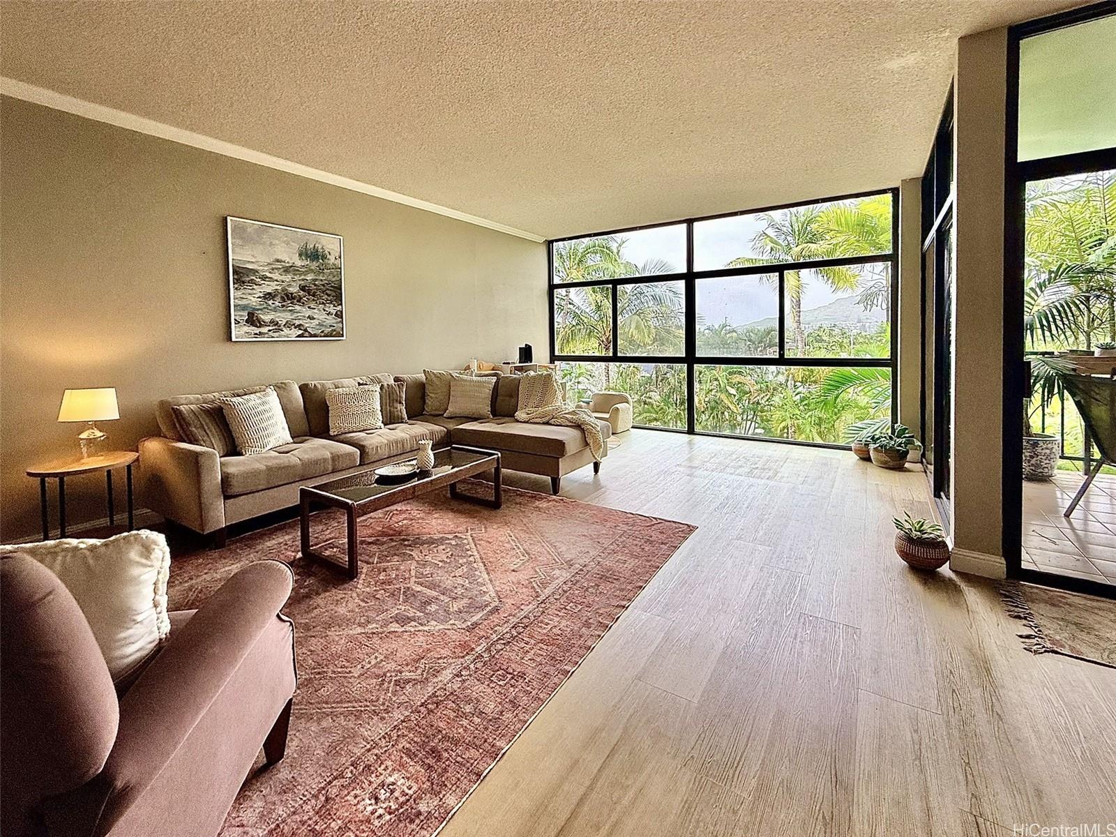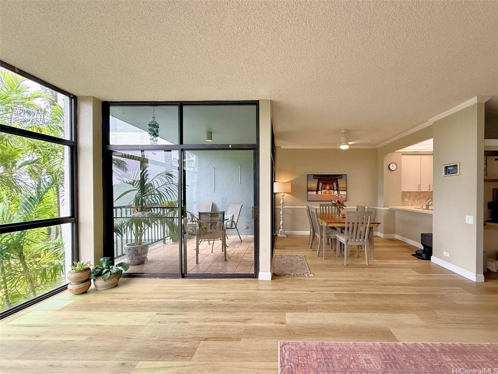 One of Kailua’s most tranquil resort-style communities, loved for its tropical landscaping, meandering koi ponds, and peaceful garden ambiance. This beautiful, well situated home offers generous space, privacy, and options for indoor-outdoor living. Welcome home to a dramatic wall of windows anchoring the main living area overlooking serene koi ponds, swaying palms, and greenery. High ceilings enhance the light-filled, treehouse-like retreat cooled by gentle tradewinds, with breathtaking floor-to-ceiling mountain views from the private lanai, kitchen, living room, and rooftop terrace. The open-concept layout is ideal for everyday living and entertaining. The primary suite downstairs boasts a large walk-in closet and ensuite bath, two bedrooms plus full bath upstairs. Ample closets and storage throughout. The rooftop lanai is perfect for relaxing or hosting against the backdrop of mountain vistas. Two covered parking stalls. Easy path to parking and Windward Harbour's exceptional amenities, pool, spa, sauna, tennis courts, BBQ areas, and rec room. Secured entry. All just minutes from famous Kailua beaches, shopping, dining, and outdoor adventures—this is island living at its best.