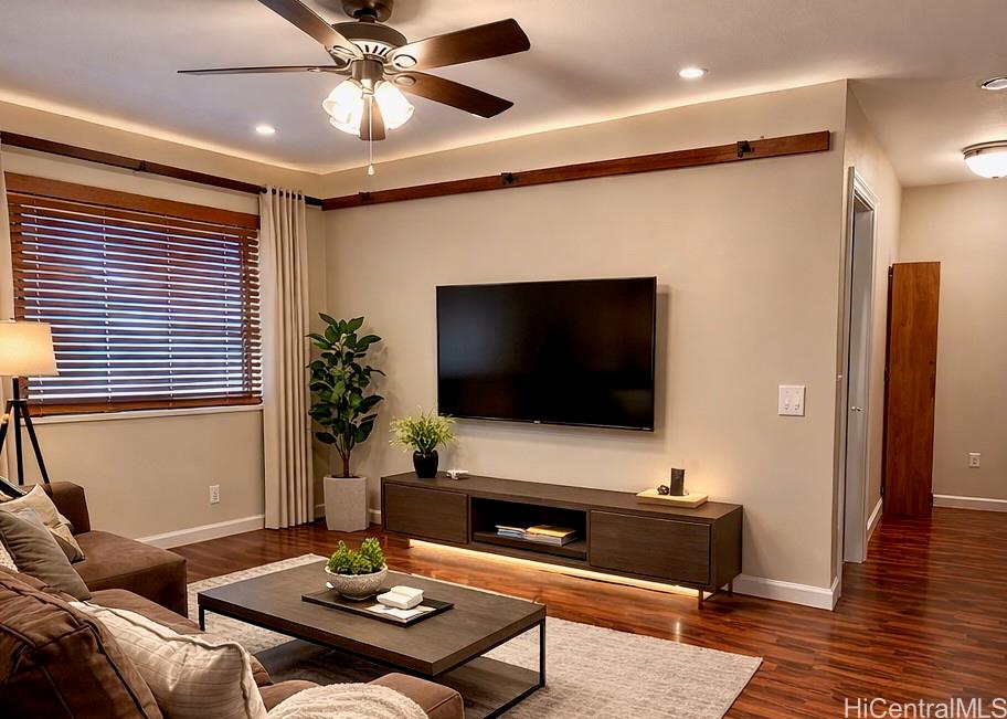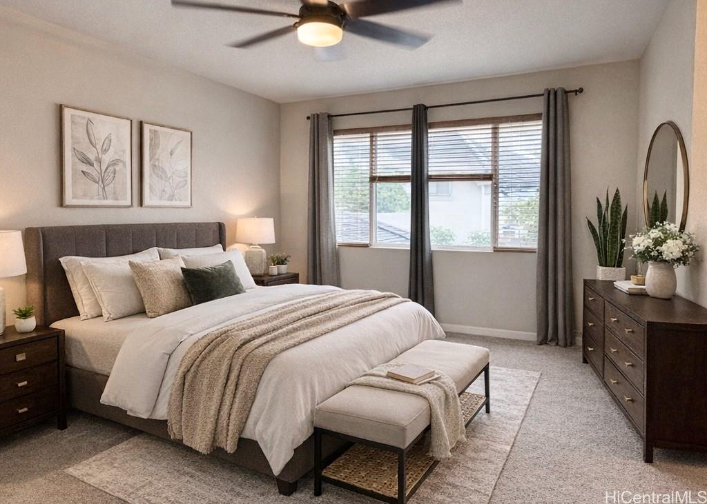 Beautiful single-family home in Ewa by Gentry Prescott featuring a spacious open floor plan and soaring vaulted ceilings that create a bright and inviting atmosphere. This well-maintained residence offers comfort and modern island living with an owned photovoltaic system and Tesla battery for energy efficiency and savings. The flexible layout includes a full bedroom and bathroom on the first floor, ideal for guests, extended family, or a home office. The kitchen offers ample cabinetry, generous counter space, a large pantry, and an island with countertop seating, opening seamlessly to the main living areas for easy entertaining. Relax under the covered lanai, perfect for gatherings or enjoying the private yard. Additional features include central AC and a lawn sprinkler system. Conveniently located near parks, golf courses, beaches, and Kapolei shopping, dining, and entertainment. First available showing is 4/1/26.