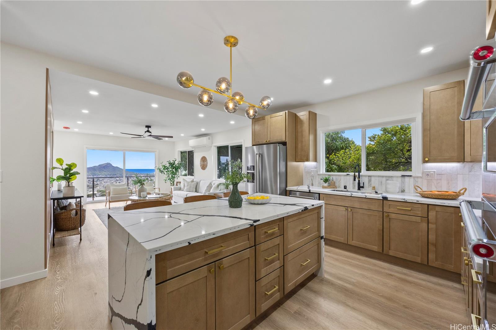 Indoor & Outdoor Living at Its Finest – Prime St. Louis Heights Hale! Experience luxury and comfort in this fully remodeled custom home, perfectly situated to capture breathtaking views of Diamond Head, Waikiki, and the coastline. Enjoy newly added balcony and oversized deck for the ultimate indoor/ outdoor living experience. Complete renovations include all new plumbing, electrical, roof, interior & exterior walls, flooring, and high end appliances. Large downstair one bedroom unit idea for multifamily living or rental income. This is a rare opportunity to own in St. Louis Heights, combining luxury, convenience, and lifestyle in one exceptional home.